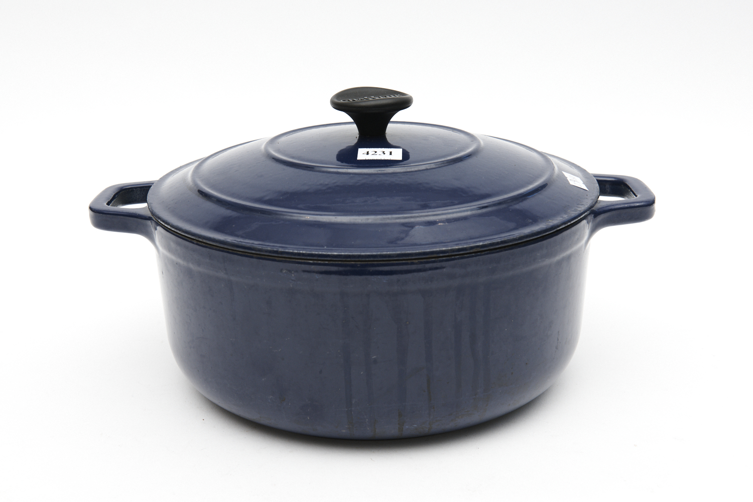 A CHASSEUR BLUE ENAMELLED CAST IRON LIDDED CASSEROLE DISH