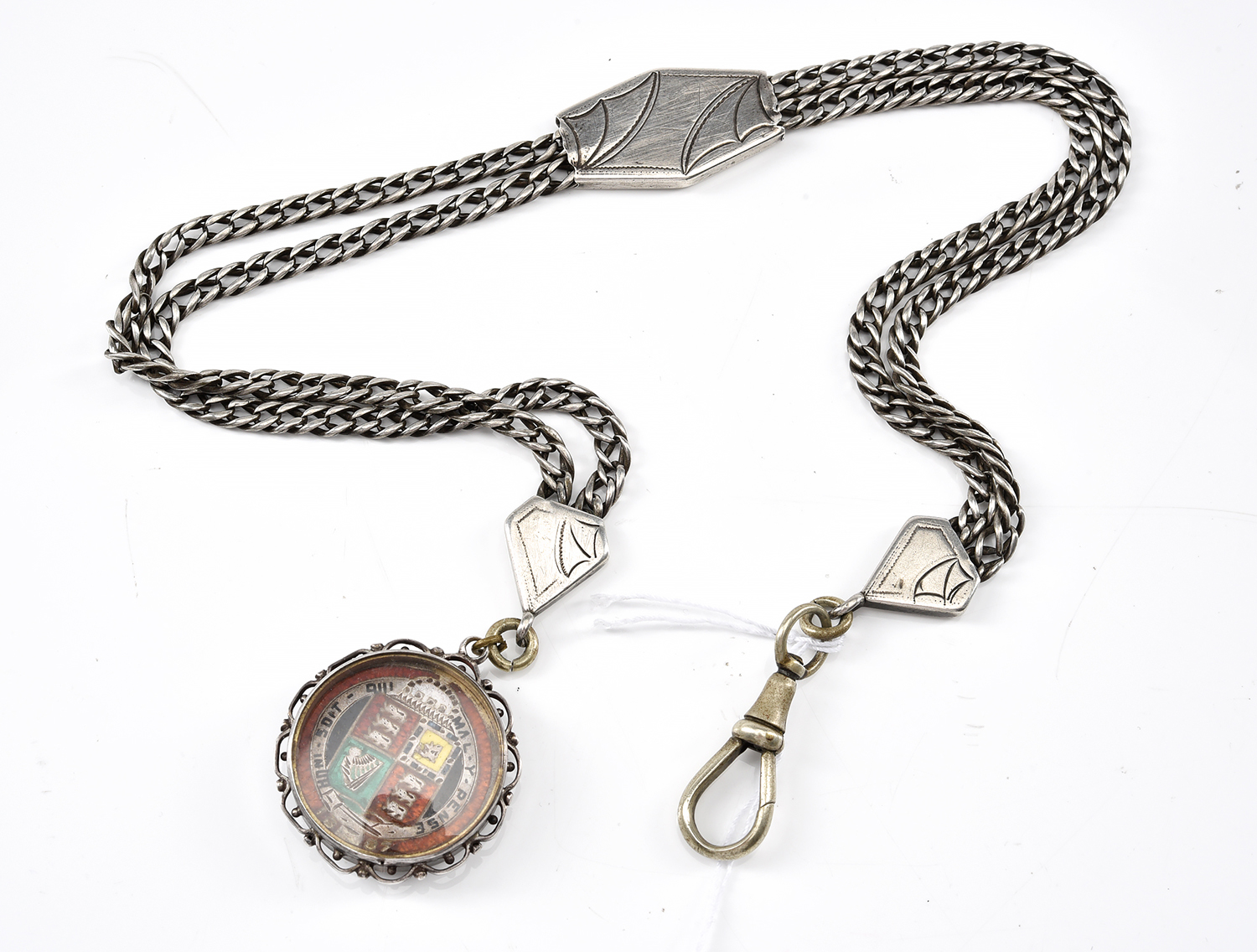 A WATCH CHAIN IN SILVER ATTACHED TO AN ENAMEL AND GILDED COIN FOB, 390MM