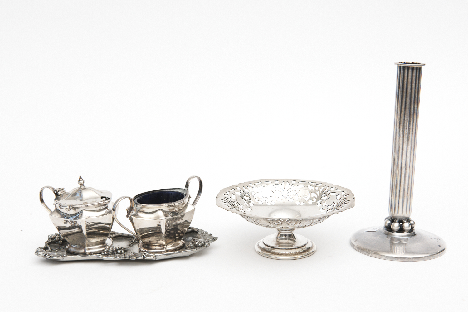 TWO STERLING SILVER SALTS ON PEWTER STAND TOGETHER WITH SILVERPLATE BOWL AND CANDLESTICK