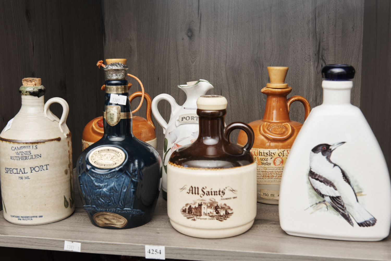 A SHELF OF VINTAGE STONEWARE, INCLUDING WHISKY, LIQUEUR AND PORT BOTTLES INCLUDING RUTHERGLEN AUSTRALIAN MAGPIE BOTTLE