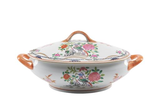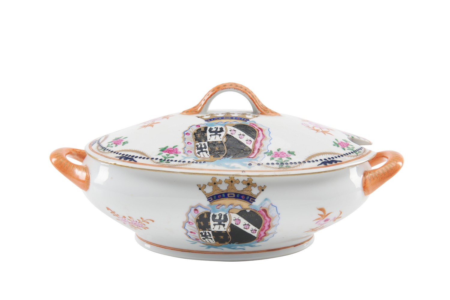 Of oval form, both the lid and dish bearing a large enamelled coat of arms to one side, with a chinoiserie bird and flower vignette to other side. Unmarked.