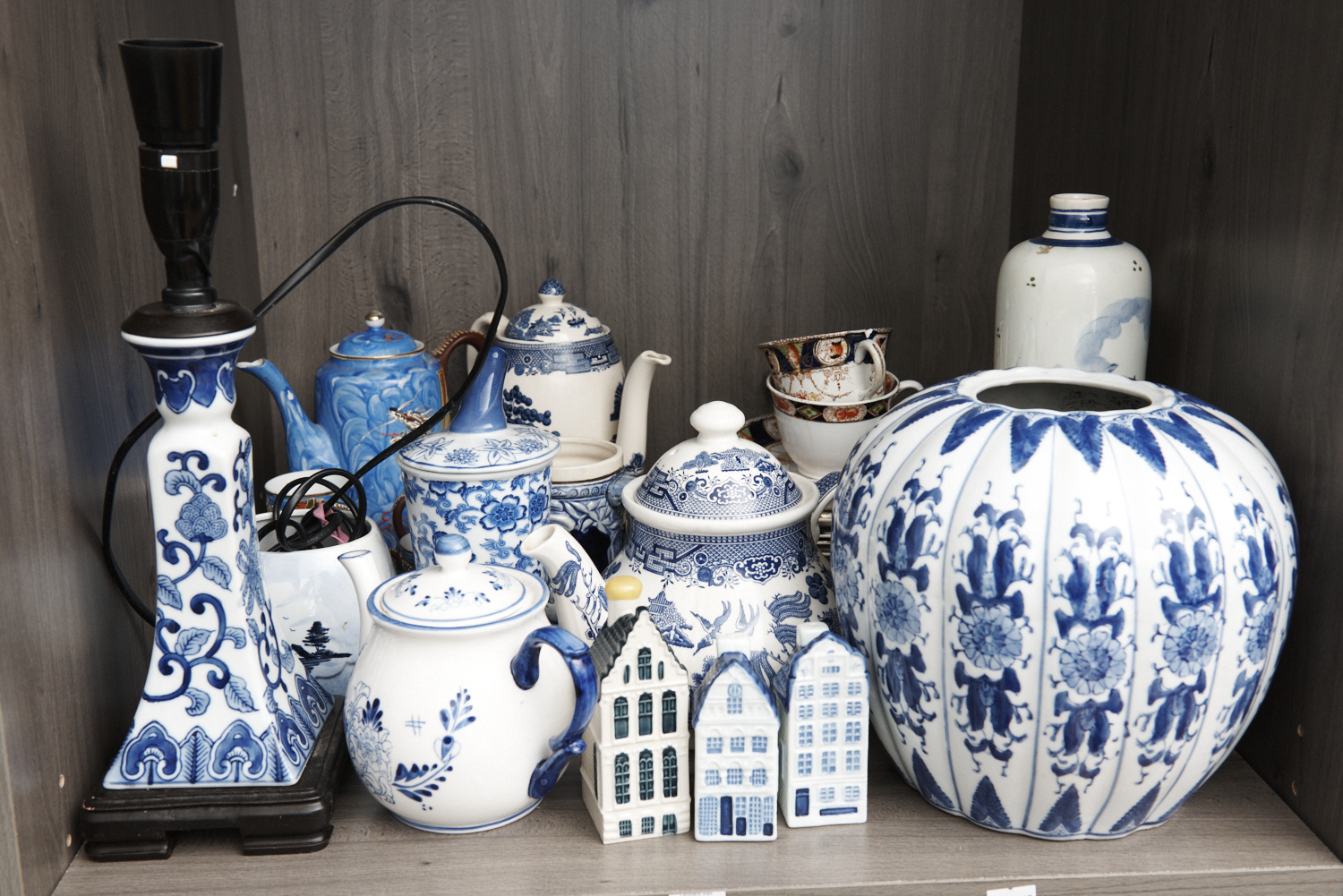 A SHELF OF COLLECTABLE CHINA, INCLUDING WILLOW PATTERN, A SASTUMA PART TEA SERVICE, A DELFT JUG AND OTHER ASSORTED ITEMS