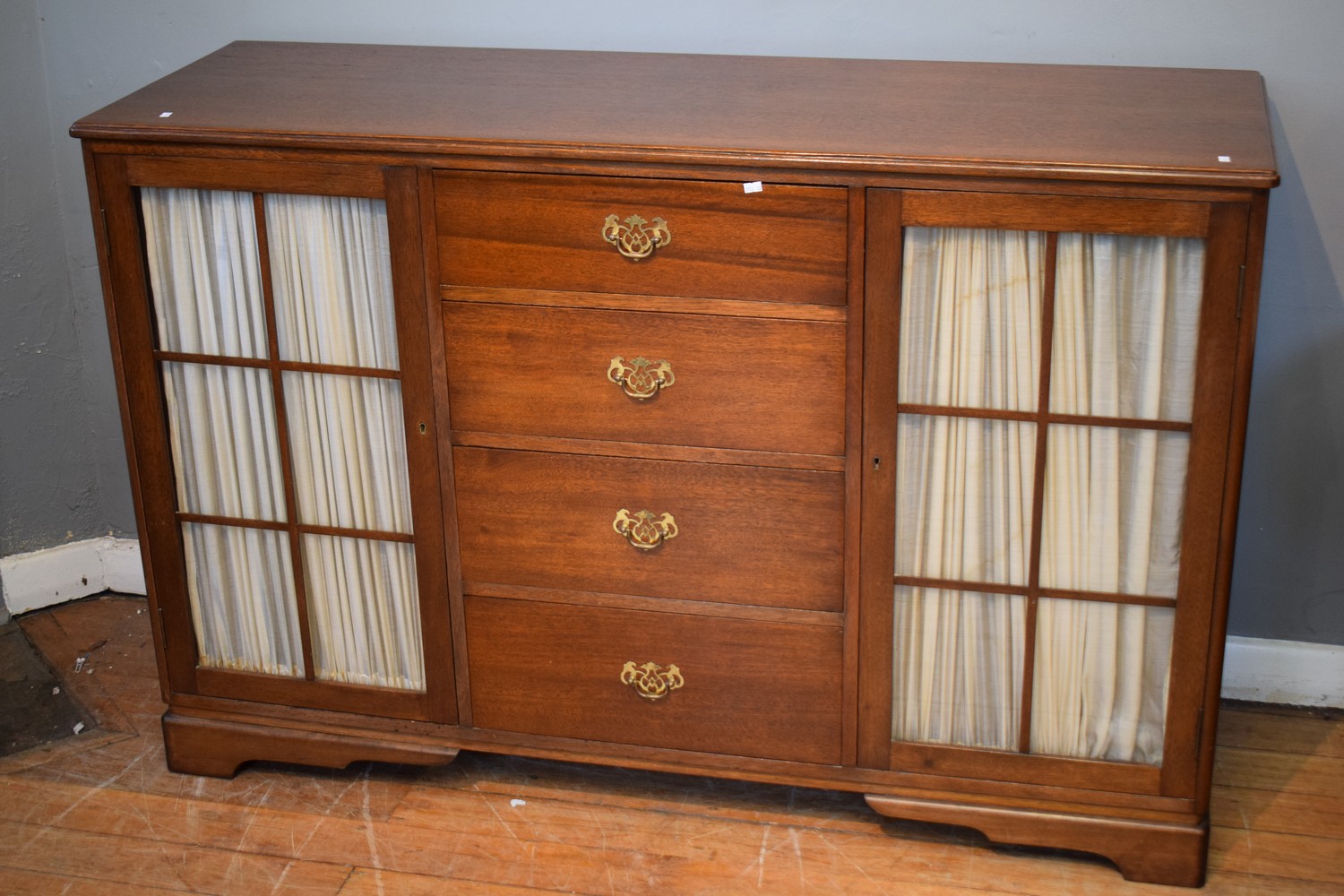 A SUBSTANTIAL FOUR DRAWER TWO DOOR SIDEBOARD (101H X 156W X 52D) (PLEASE NOTE THIS ITEM MUST BE REMOVED BY CLIENTS OR CARRIERS AT THE CUSTOMERS EXPENSE) (TWO KEYS IN OFFICE)