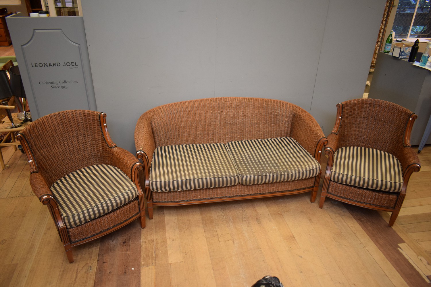 A THREE PIECE WICKER AND CANE SETTING COMPRISING CHAIRS AND SOFA (SOFA 85H X 170W X 100D)