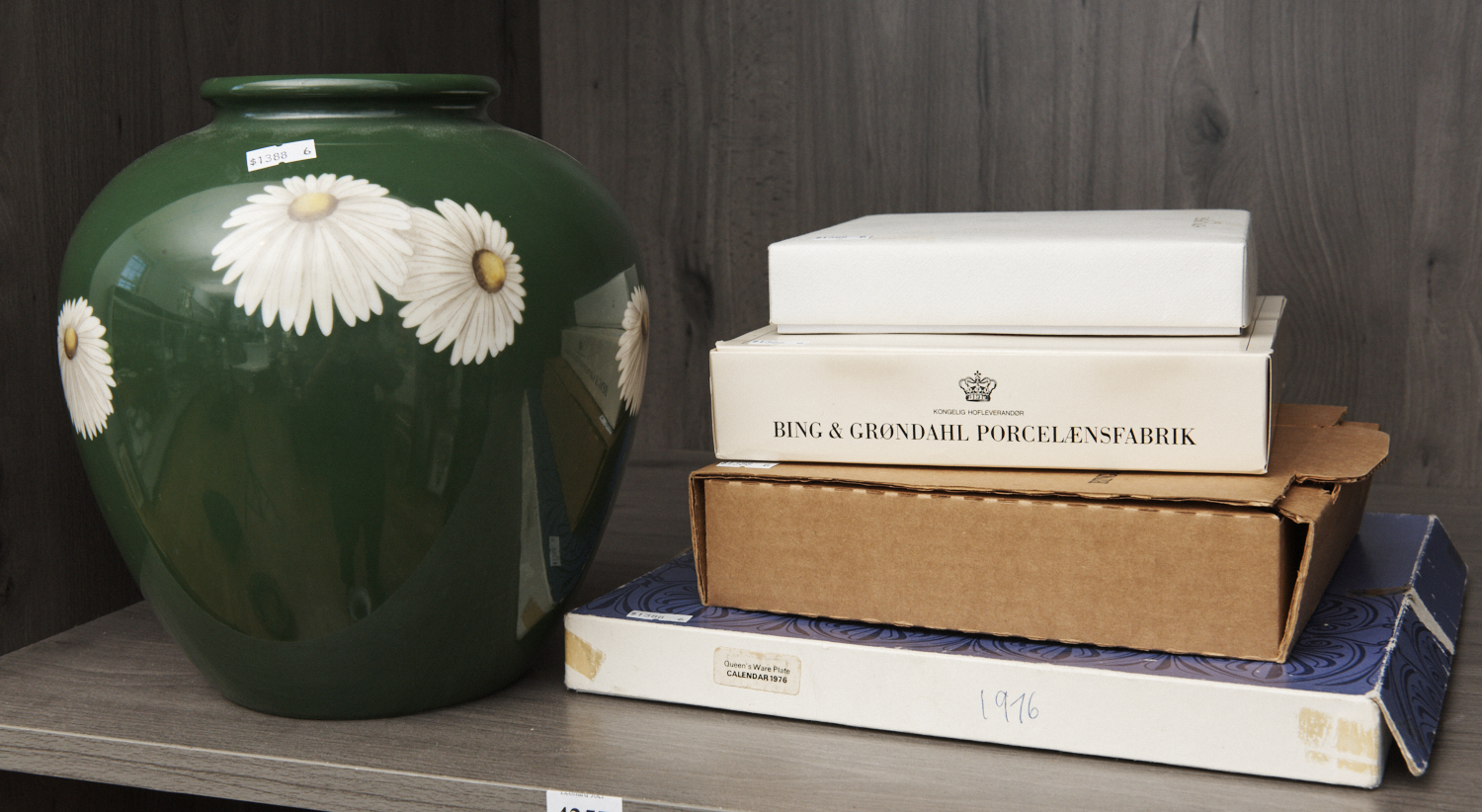 A COLLECTION OF ITEMS, INCLUDING A GREEN GROUND VASE, ROYAL COPENHAGEN MOANSH UNIVERSITY PLATE AND WEDGWOOD 1976 YEAR PLATE