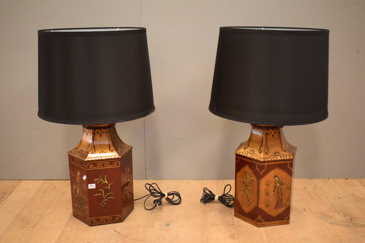 A PAIR OF PAINTED CHINOISERIE STYLE TABLE LAMPS WITH SHADES