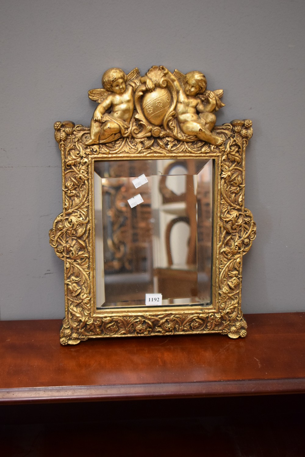 A DECORATIVE GILT TABLE MIRROR WITH CHERUB MOTIFS