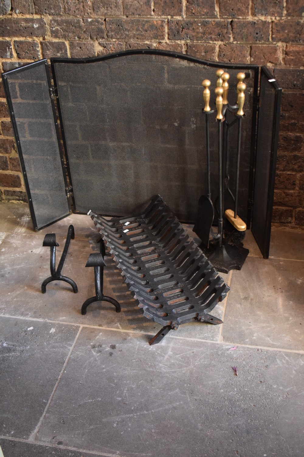 A SET OF FIRE TOOLS, SCREEN AND FIRE DOGS