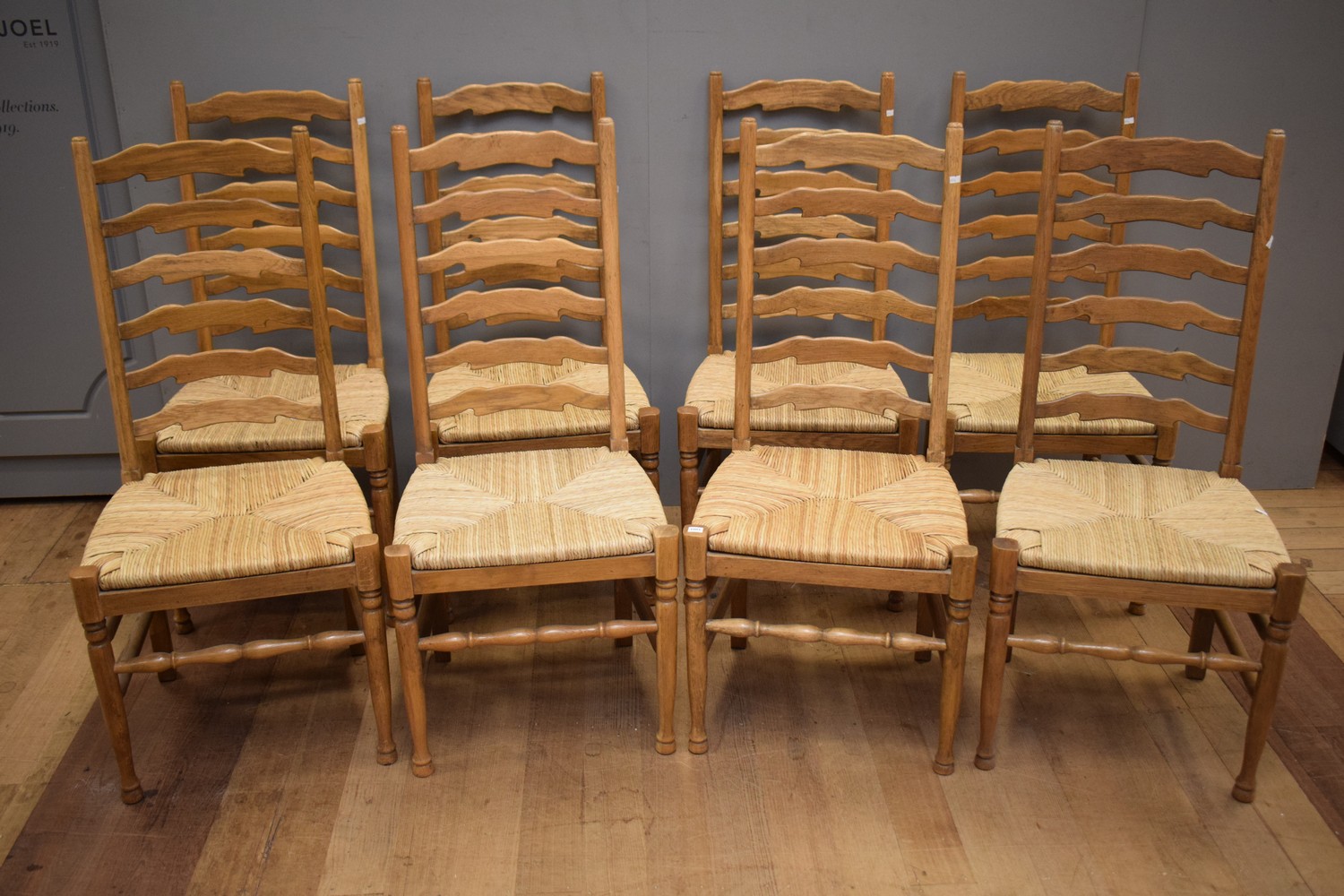 A SET OF EIGHT LADDER BACK DINING CHAIRS WITH RATTAN SEATS