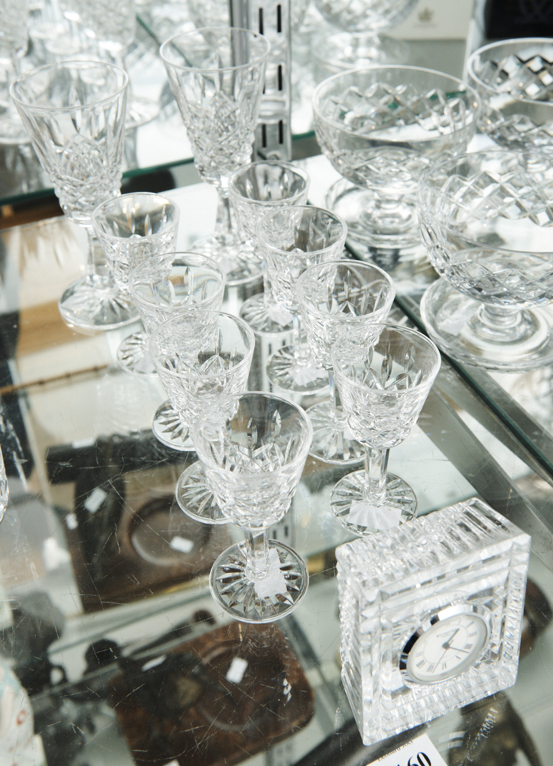 A SET OF EIGHT WATERFORD CRYSTAL LIQUEUR GLASSES (ONE WITH A SMALL CHIP TO THE RIM),TWO WATERFORD CRYSTAL SHERRY GLASSES AND A WATERFORD CRYSTAL DESK CLOCK, THE SHERRY GLASSES 13.5 CM HIGH