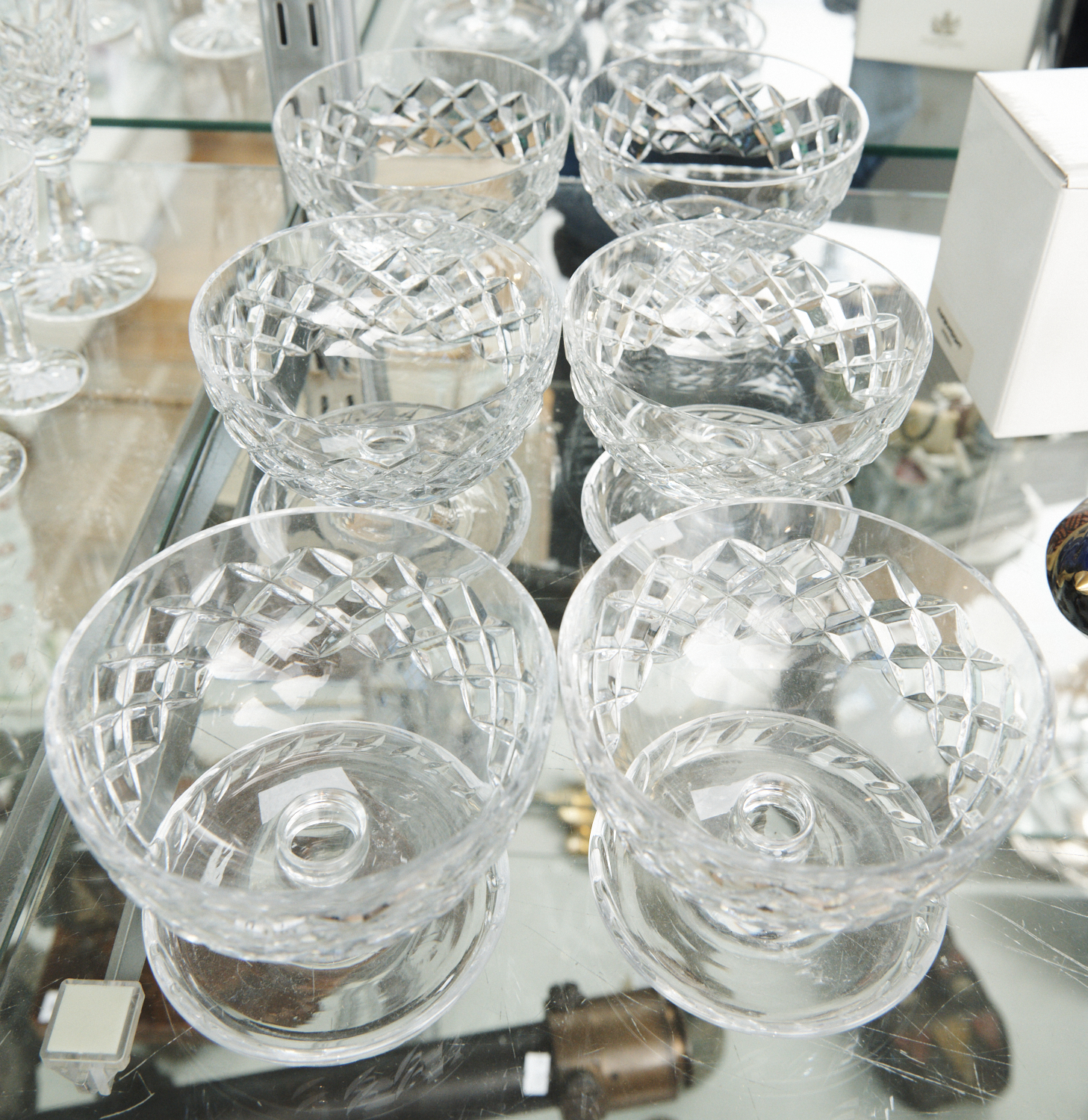 A SET OF SIX CUT CRYSTAL DESSERT BOWLS, (ONE WITH A CHIP TO THE RIM), 10 CM DIAMETER X 8.5 CM HIGH