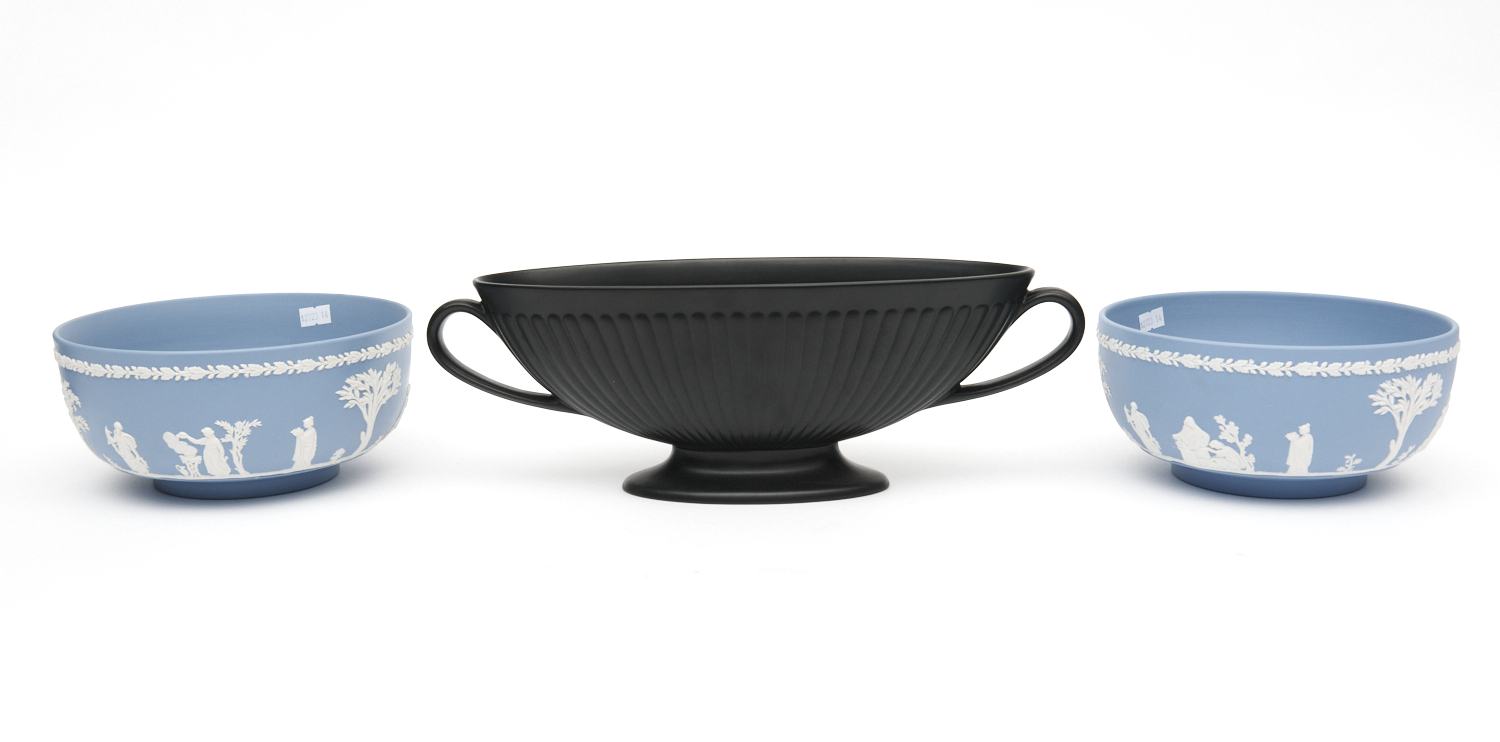 TWO WEDGWOOD BLUE JASPERWARE BOWLS AND A WEDGWOOD BLACK MATT GLAZED TWO HANDLED BOWL, THE BLUE JASPERWARE BOWLS EACH 20 CM DIAMETER X 9.5 CM HIGH