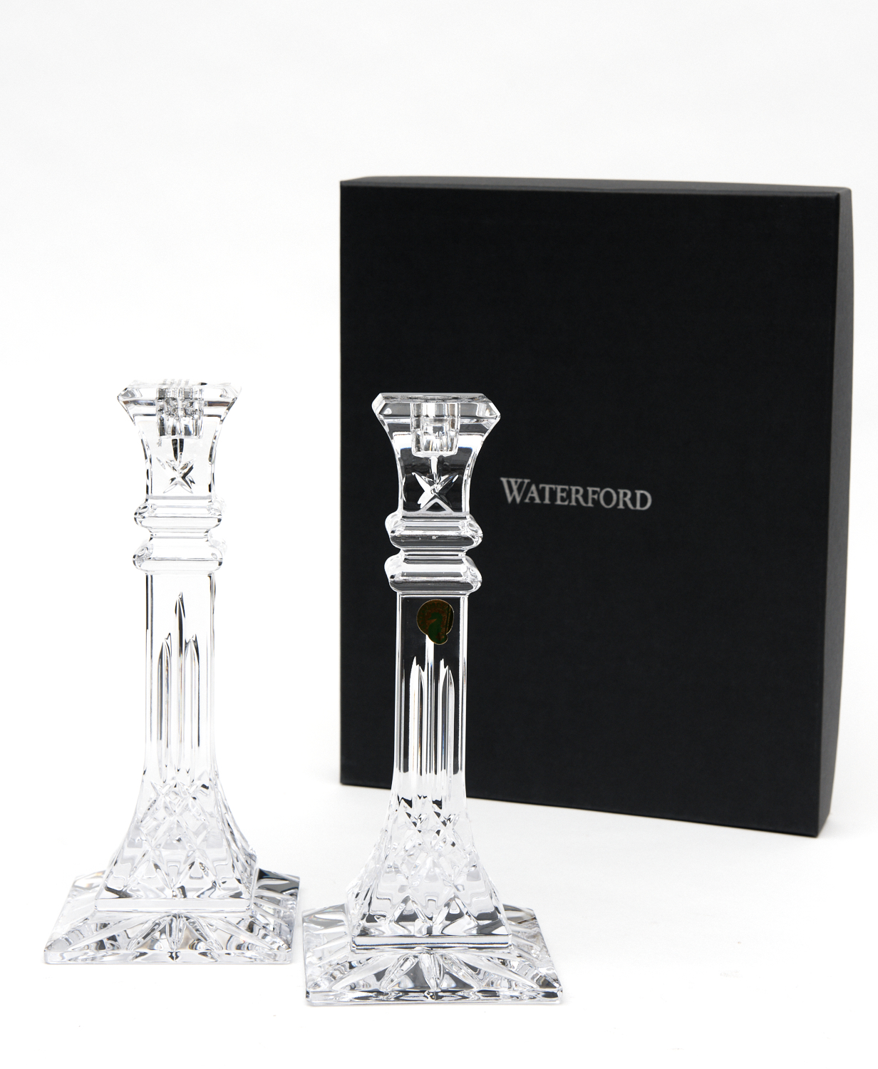 A PAIR OF WATERFORD 'LISMORE' CRYSTAL CANDLESTICKS, BOXED, 25.5 CM HIGH