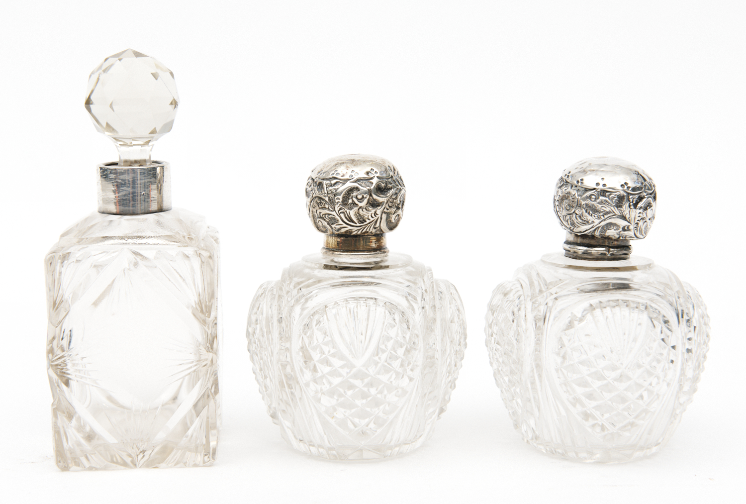 A GROUP OF THREE CRYSTAL AND SILVER SCENT BOTTLES