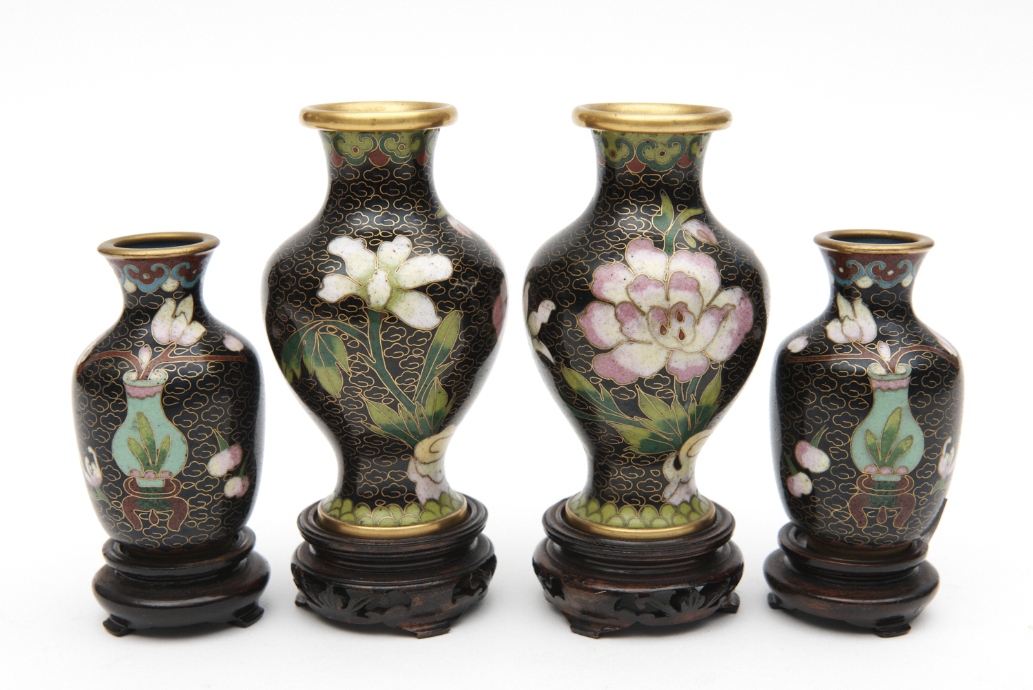 A COLLECTION OF CLOISONNE VASES ON STANDS