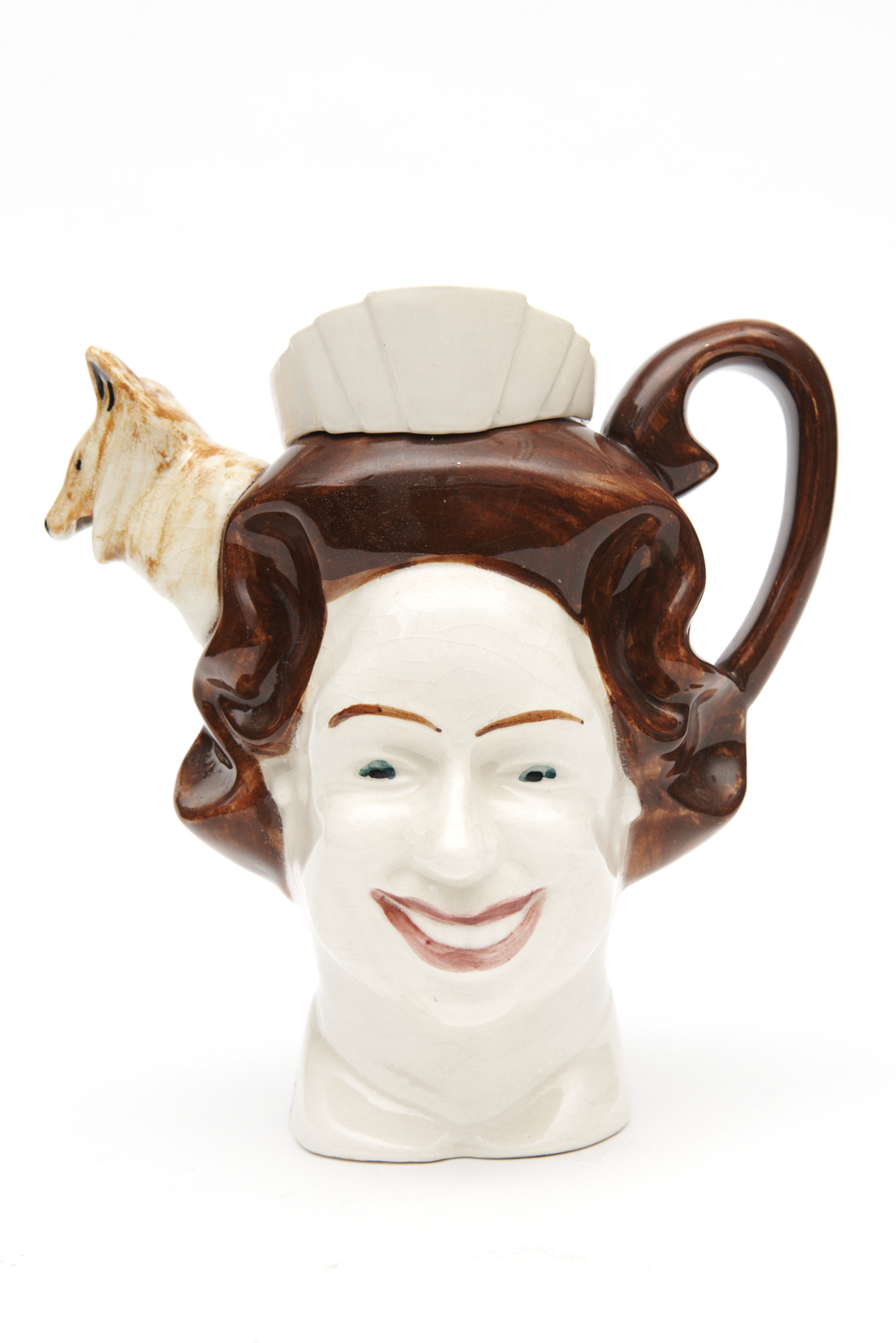 A QUEEN ELIZABETH TEAPOT WITH CORGI SPOUT BY EXILE CERAMICS 1981 HEIGHT 22CM