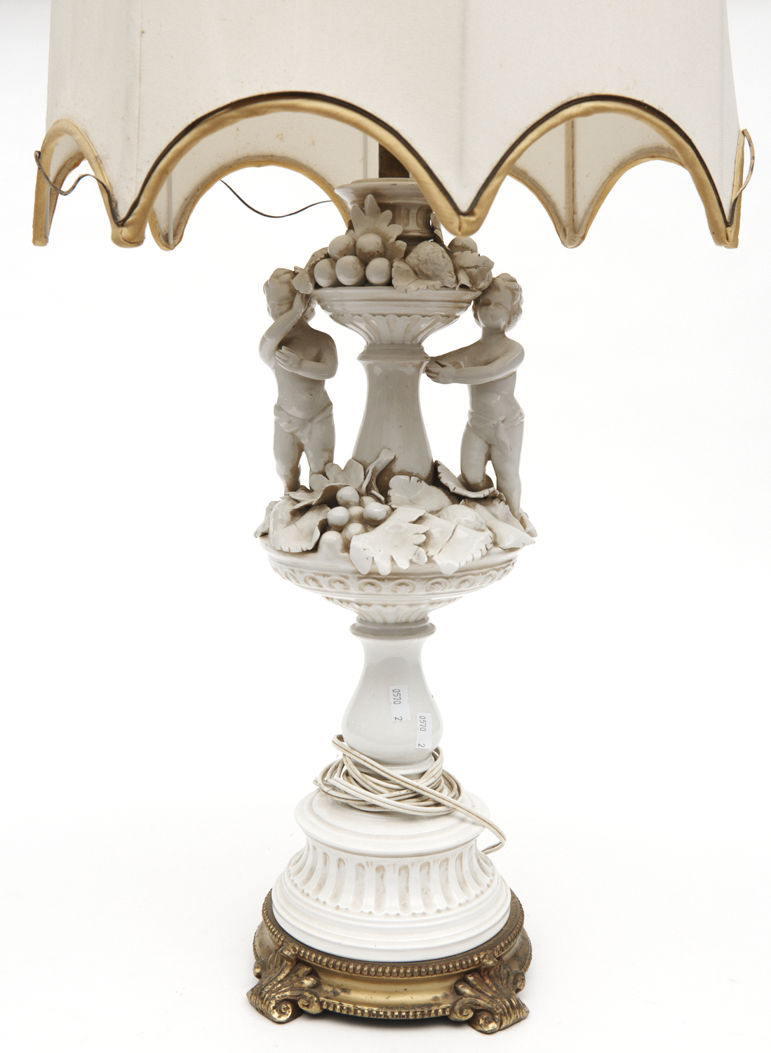 A WHITE GLAZED CERAMIC LAMP APPLIED WITH CHERUBS, POSSIBLY ITALIAN HEIGHT 86CM