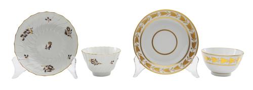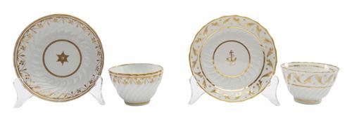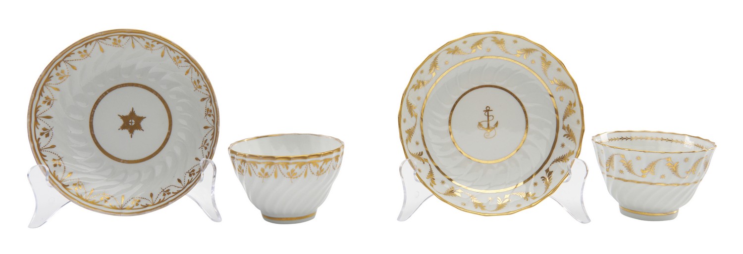 Three sets wrythen in form, the other of typical shape, all painted with classical motifs in gilded decoration. Two incised with a B to underside.
