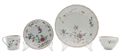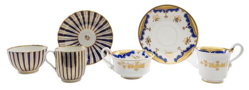 The first set comprising a tea cup, coffee cup and saucer decorated in a blue and egg yolk palette, painted 'Spode 4600' to reverse in red. The second set, comprising a tea cup, coffee cup and saucer, decorated in gilt- blue stripes, no marks to reverse, Flight Worcester, circa 1785. The third set is Caughley, comprising a coffee can, saucer and underplate, decorated in Angouleme sprigs motifs, the coffee can and saucer with the crest and cipher of Sir John Webb of Oldstock, Wiltshire, no marks to reverse, circa 1785. The fourth set is Chamberlain's Worcester, comprising a coffee cup, tea cup, saucer and underplate, decorated in Chamberlain's pattern no. 2 with Chinese inspired floral motifs, 'No. 2' painted in red to reverse of underplate, circa 1797.
