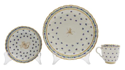 The third set with small chip to footrim of cup,the saucer with paint splashes to saucer. the underplate with significant gilding loss.