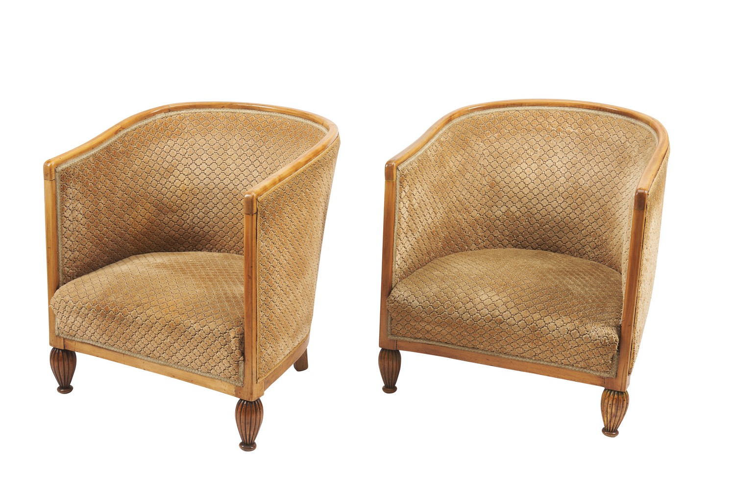 The walnut chairs, of typical form, each with a rounded back, deep seats, and both covered in their original fabric, raised on reeded ovoid shaped supports, on bun feet.