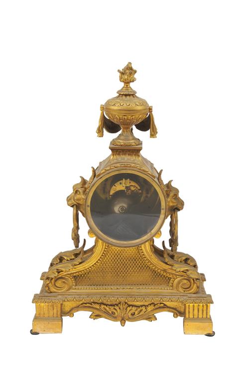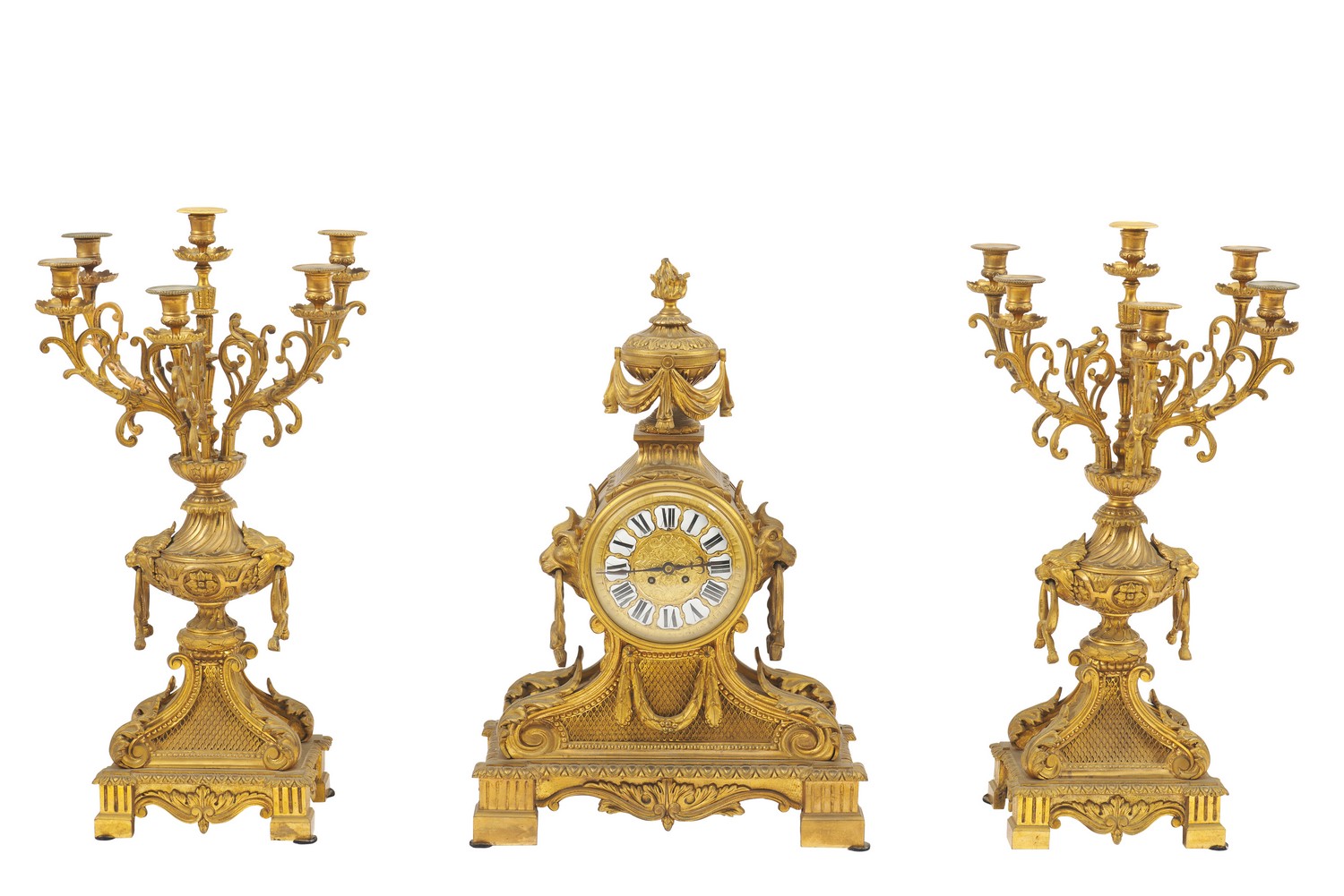 A FRENCH LOUIS XVI STYLE GILT METAL CLOCK GARNITURE