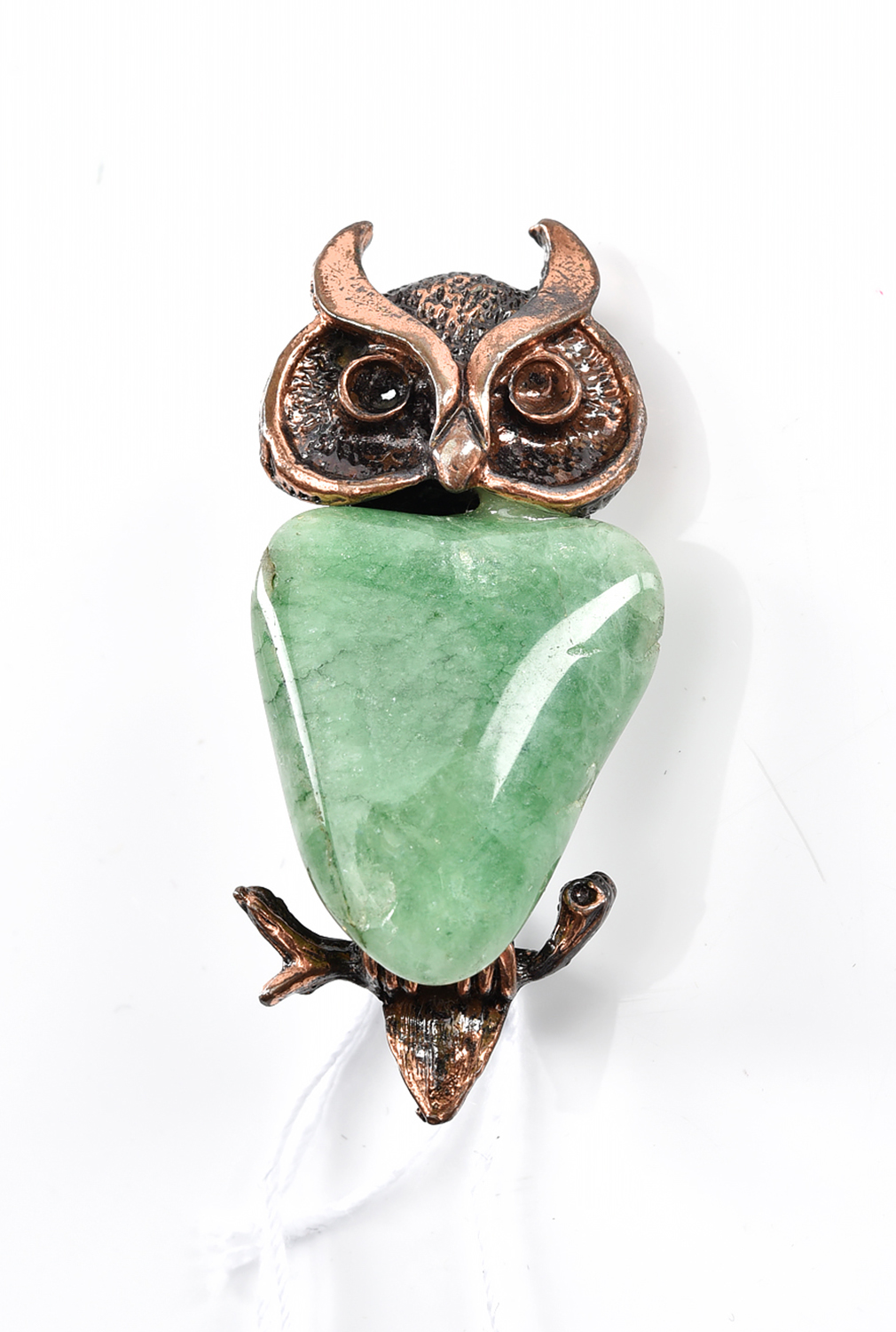 A GREEN STONE SET OWL BROOCH IN BRONZE AND COPPER, TOTAL LENGTH 40MM APPROXIMATELY