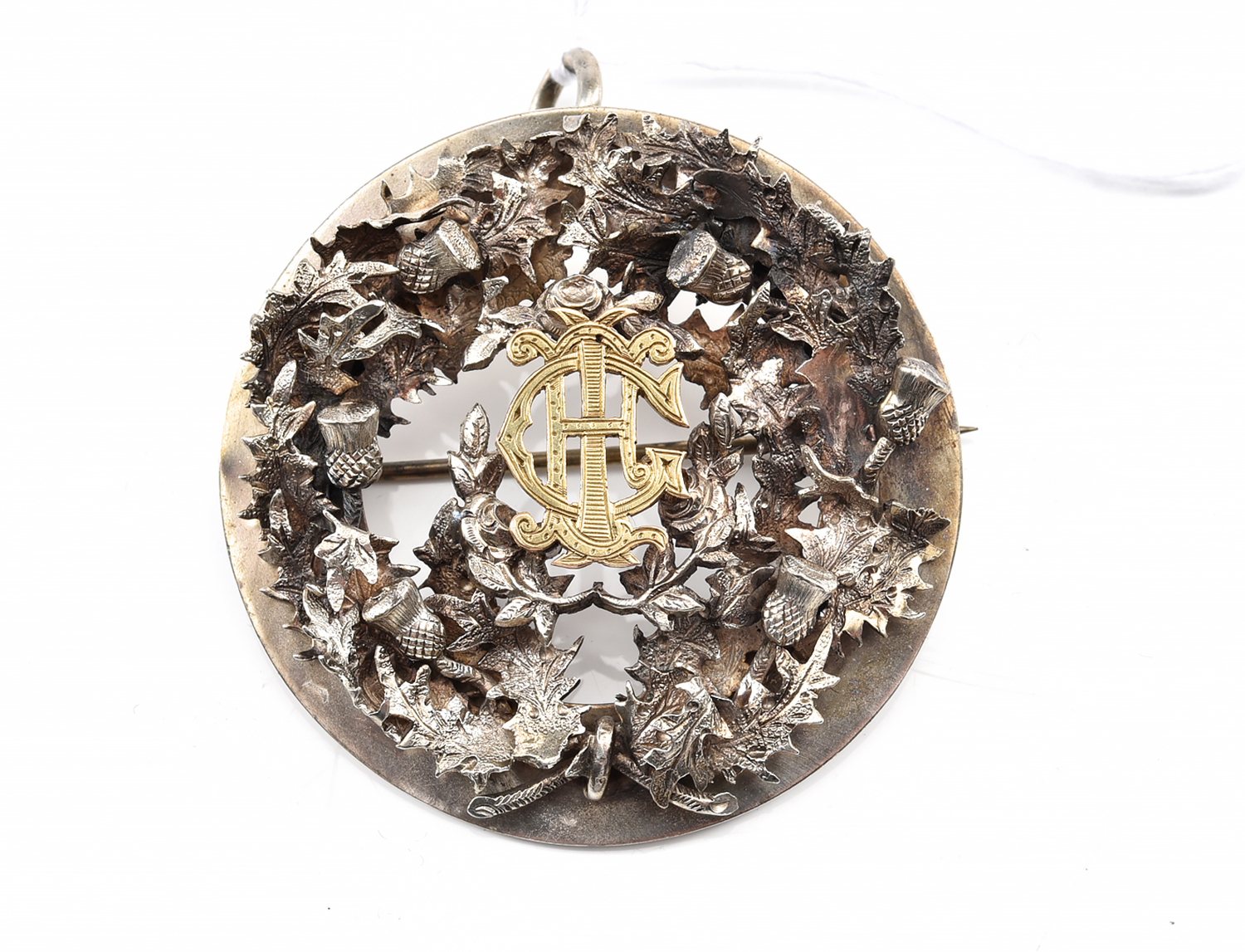 A COMMEMORATIVE BROOCH DEPICTING IN RELIEF HOLLY LEAVES AND ACORNS, THE CENTRE SET WITH A MONOGRAM (POSSIBLY IN GOLD), DATED ON THE REVERSE 11th JULY 1879, IN SILVER, DIAMETER 46MM