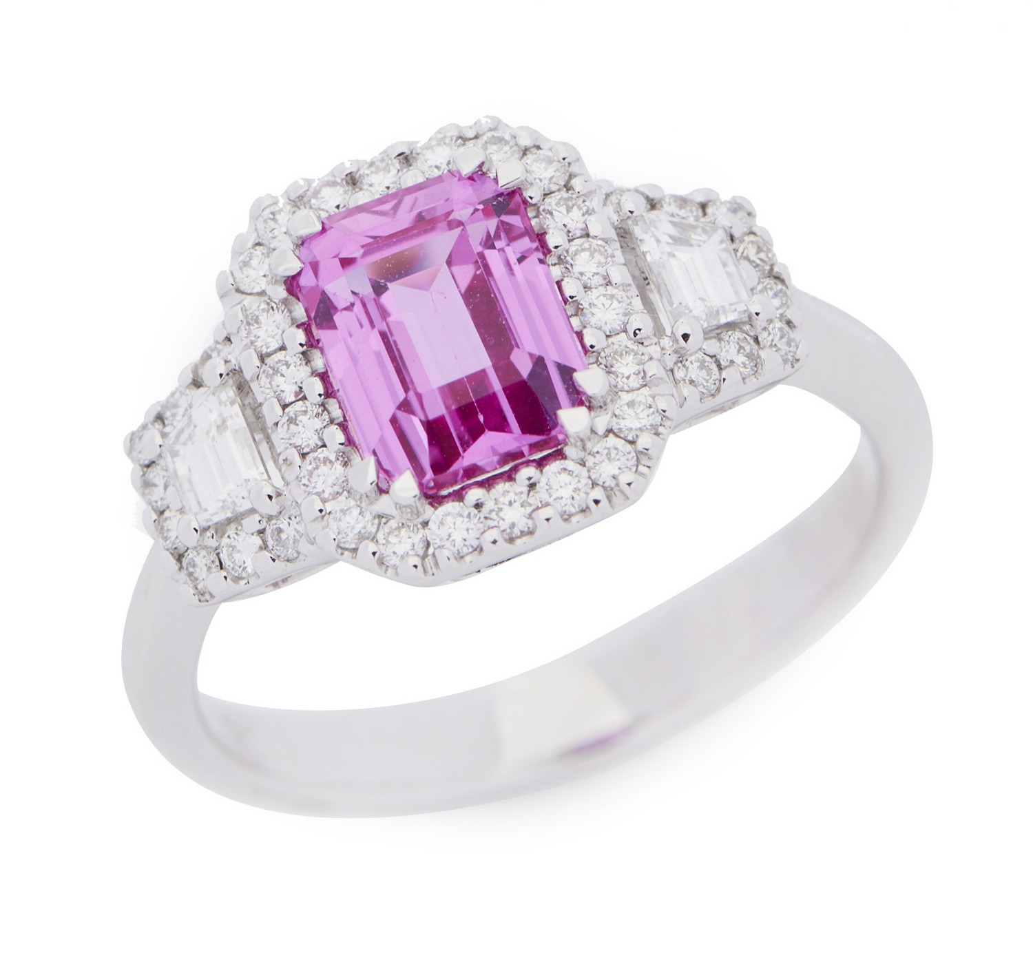 A THREE STONE DIAMOND RING - Featuring a princess cut diamond weighing an estimated 1.05cts, flanked by princess cut diamonds totall...