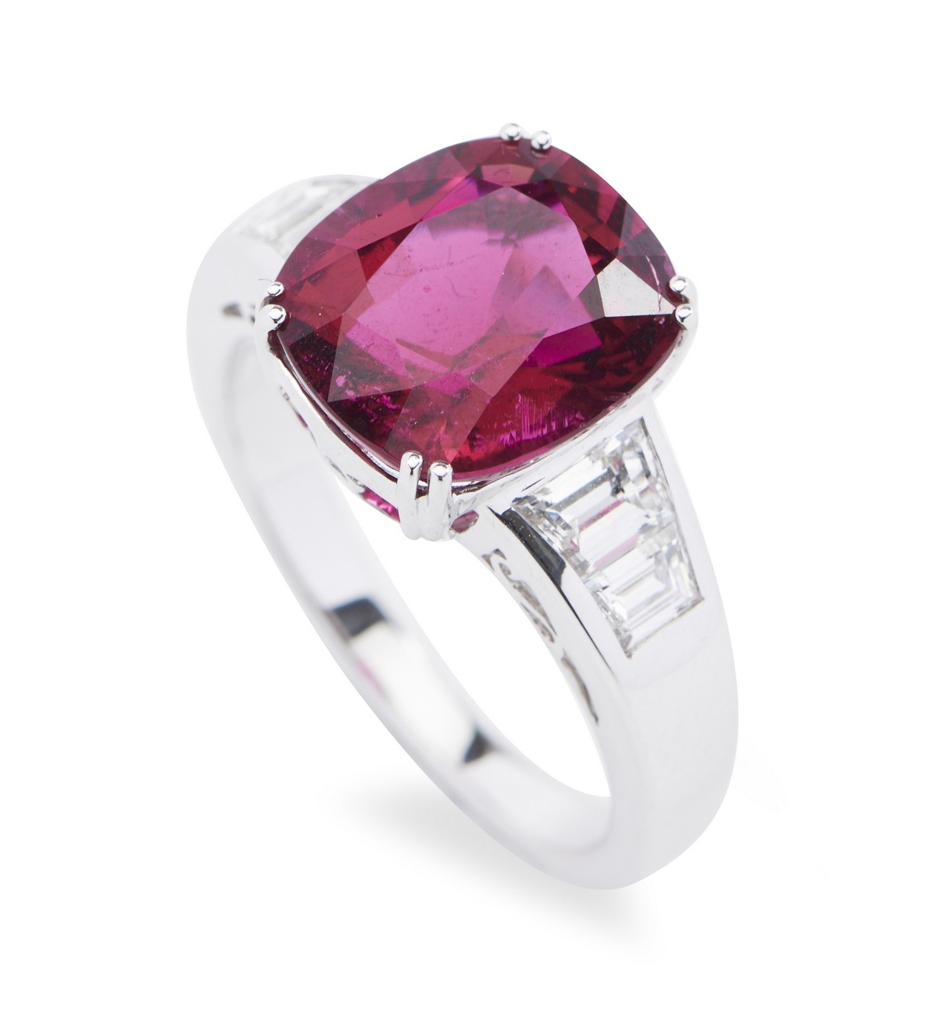 A THREE STONE DIAMOND RING - Featuring a princess cut diamond weighing an estimated 1.05cts, flanked by princess cut diamonds totall...