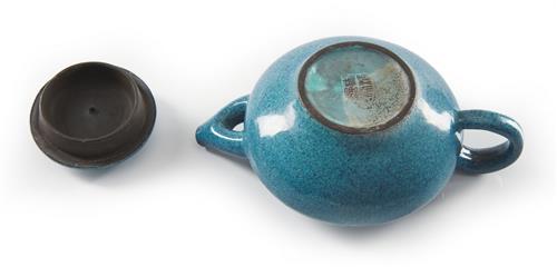 With y-shaped spout in deep purplish-brown clay, covered in a robin's egg enamel glaze. Seal marks to the lid and base, unread.