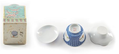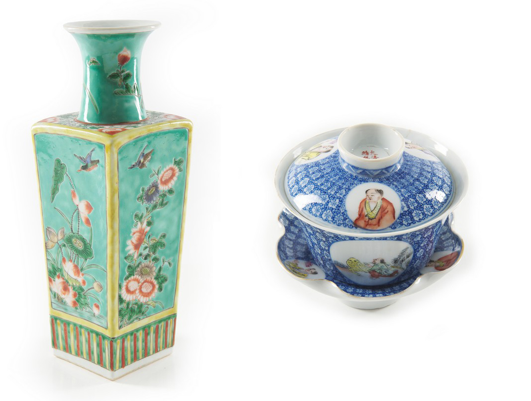 The faceted vase decorated with plants representing the four seasons. The cup with famille rose figures in roundels against an blue diaper ground, Guangxu mark in iron red to the base.