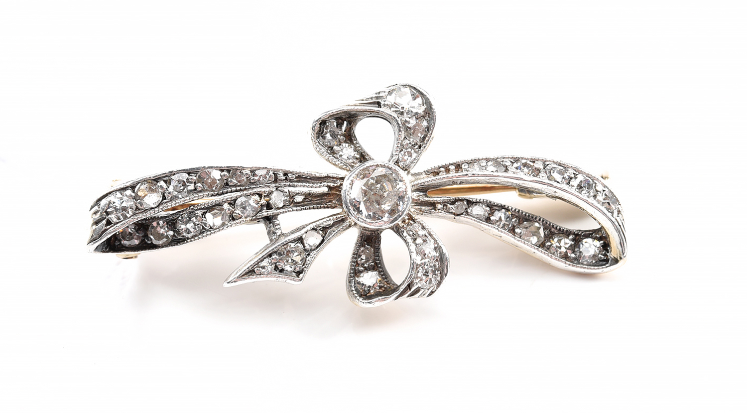 A VICTORIAN DIAMOND BOW BROOCH IN GOLD AND SILVER, total weight 2.9gms