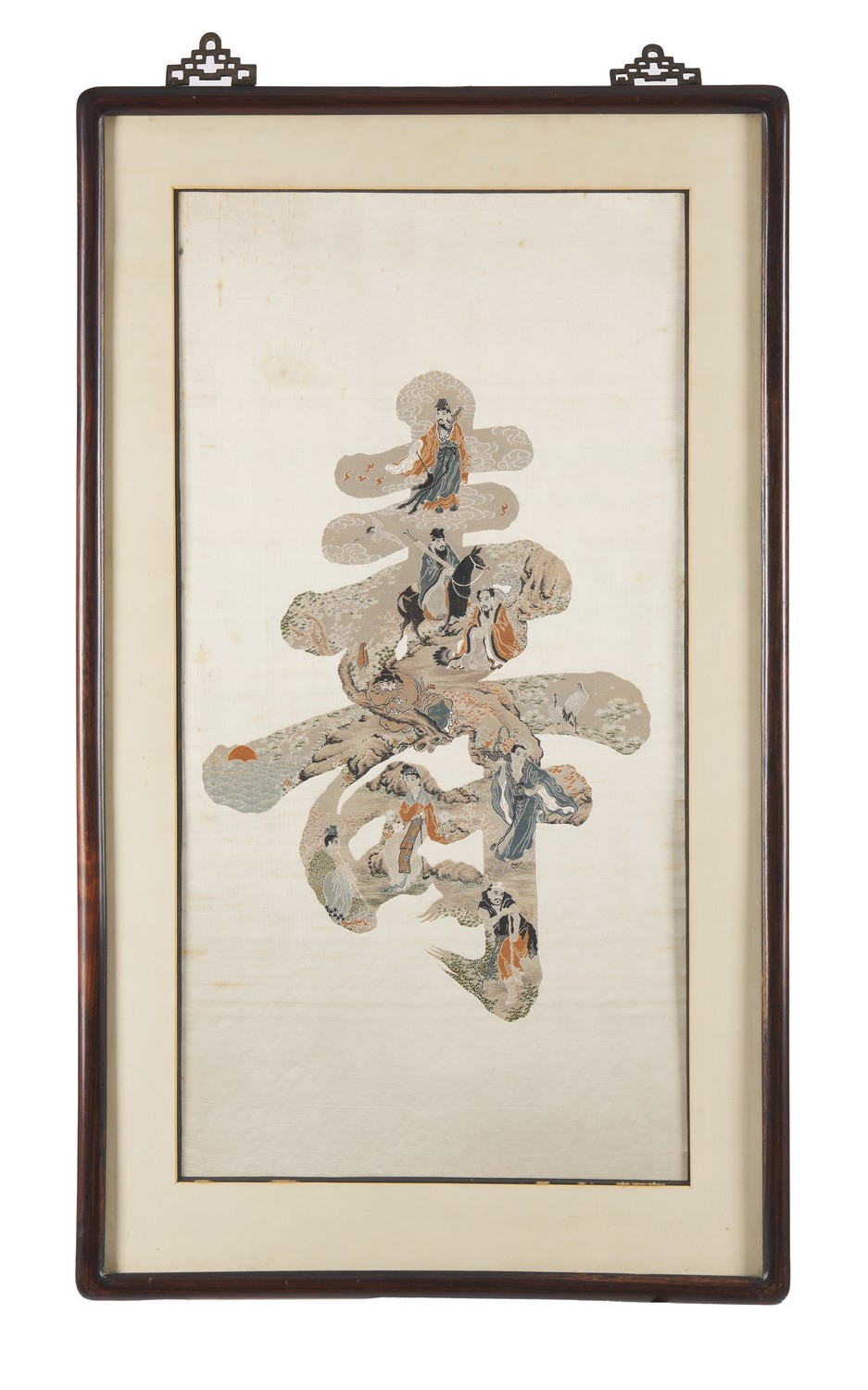 Depicting a Shou character against a white ground, the character containing the seven immortals in various positions. Framed and glazed.