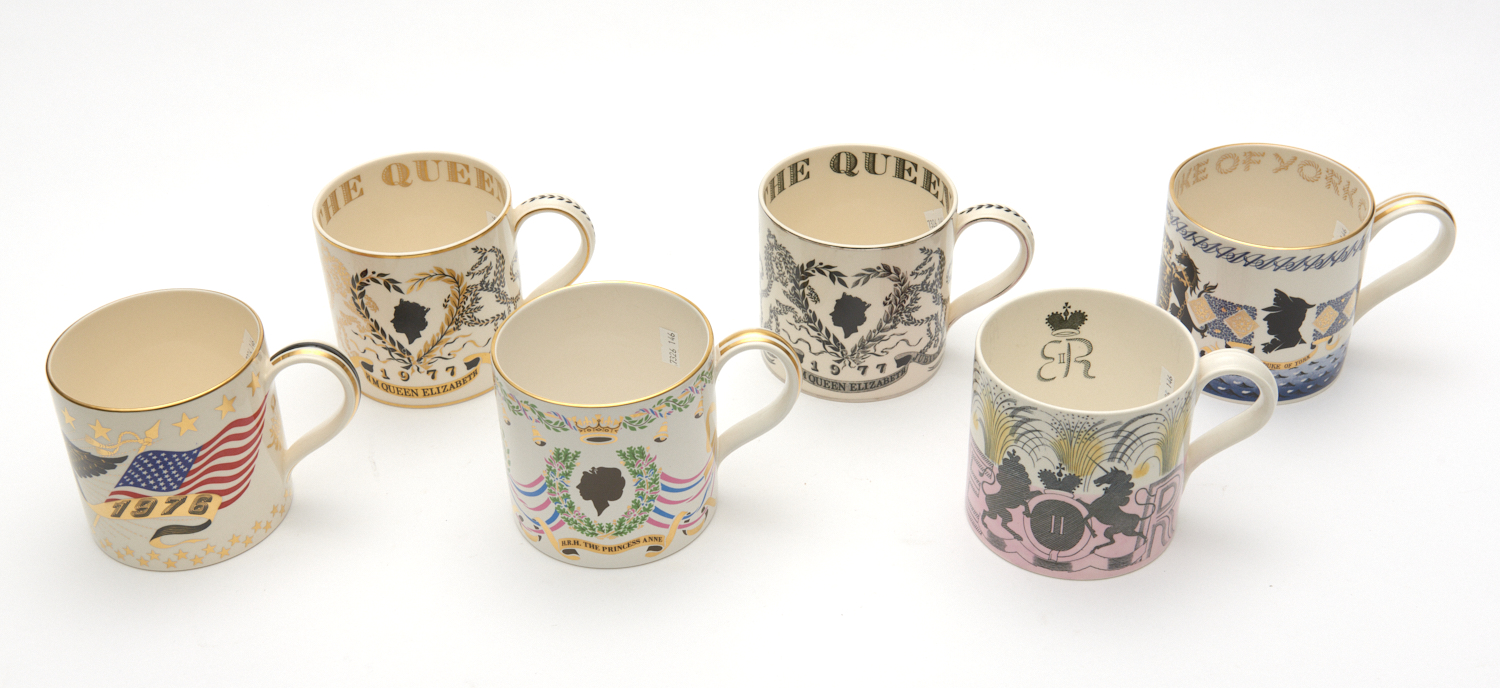 A COLLECTION OF SIX ROYAL MEMORABILIA MUGS INCLUDING WEDGWOOD
