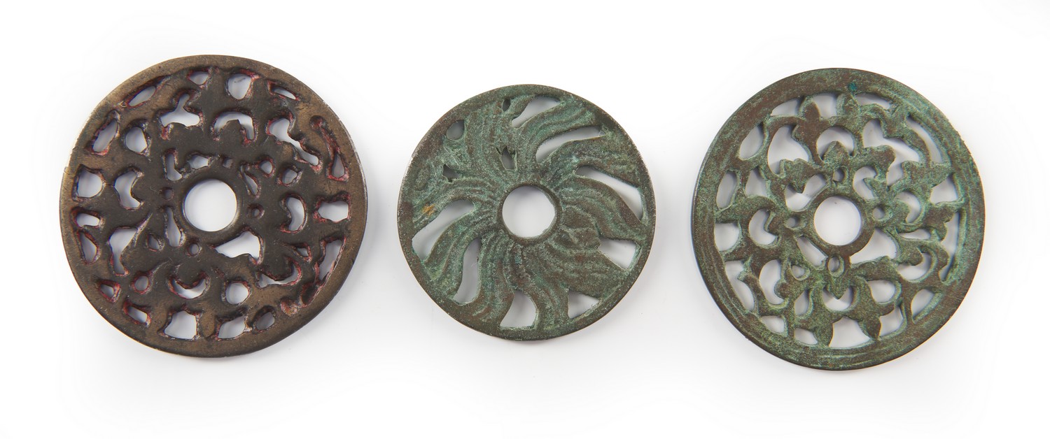 The cast bronze numismatic charms with pierced lotus surrounding the central hole.
