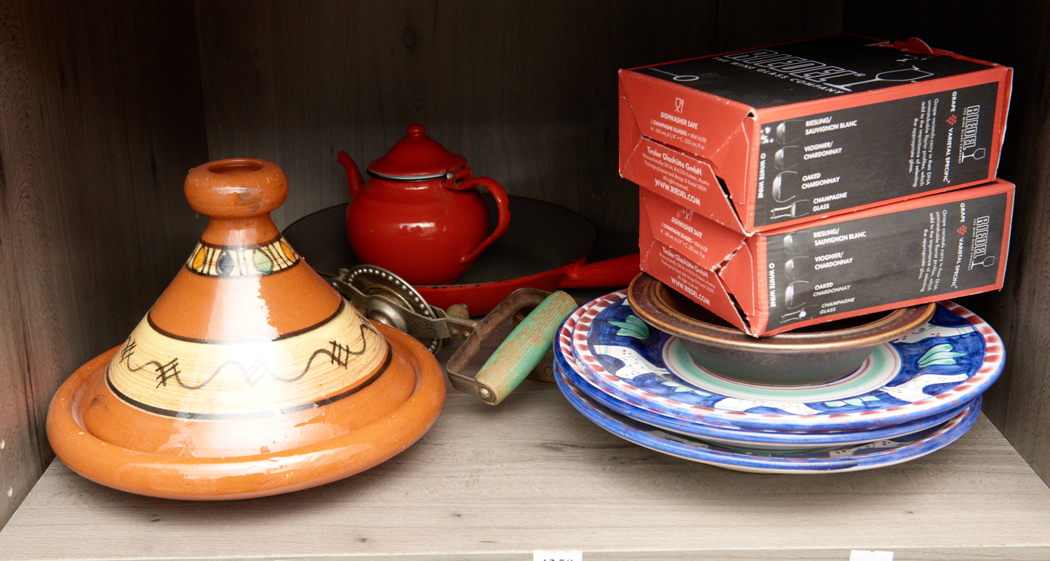 A SHELF OF VINTAGE KITCHEN WARES, INCLUDING A LE CREUSET ENAMELLED CAST IRON 26CM FRYING PAN, AN EGG BEATER, A RED ENAMELLED METAL TEAPOT AND OTHER ITEMS