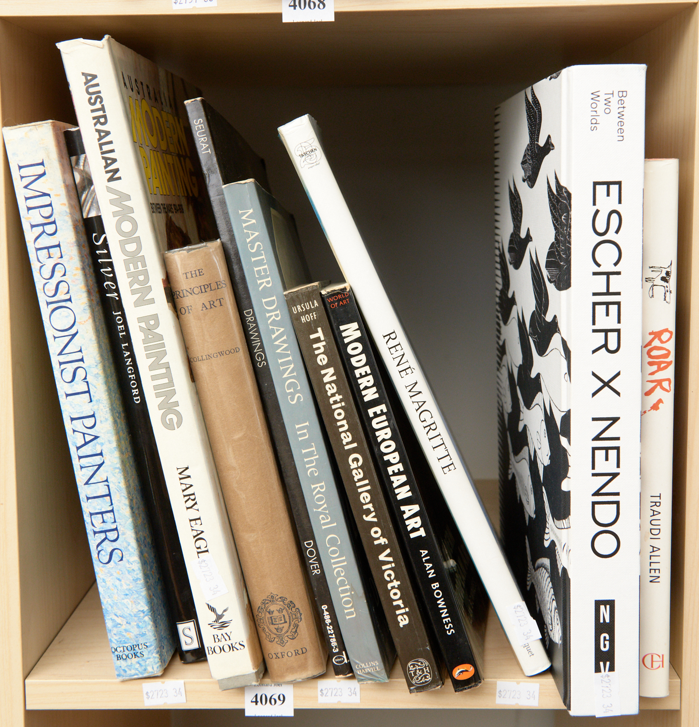 A SHELF OF BOOKS RELATING TO ART, INCLUDING BETWEEN TWO WORKS, ESCHER/NENDO
