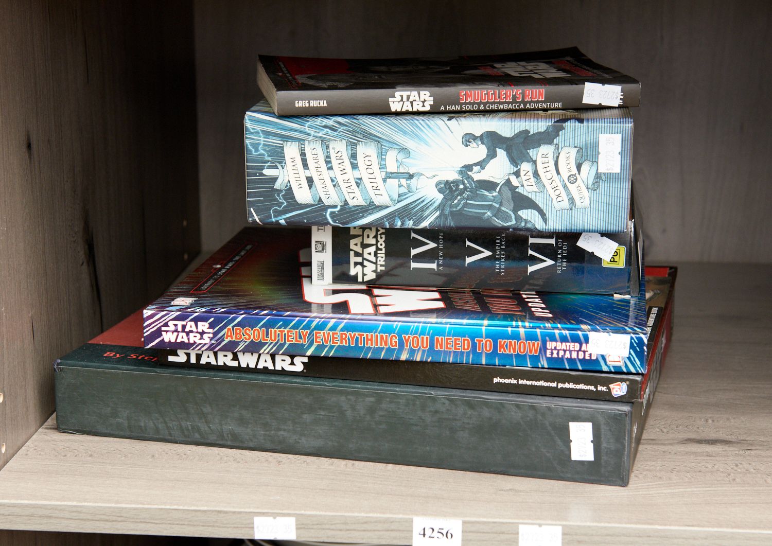 A SHELF OF STAR WARS RELATED ITEMS, INCLUDING FLASHLIGHT ADVENTURE BOOK, WILLIAM SHAKESPEARE'S STAR WARS TRILOGY AND A BOX OF DVDS