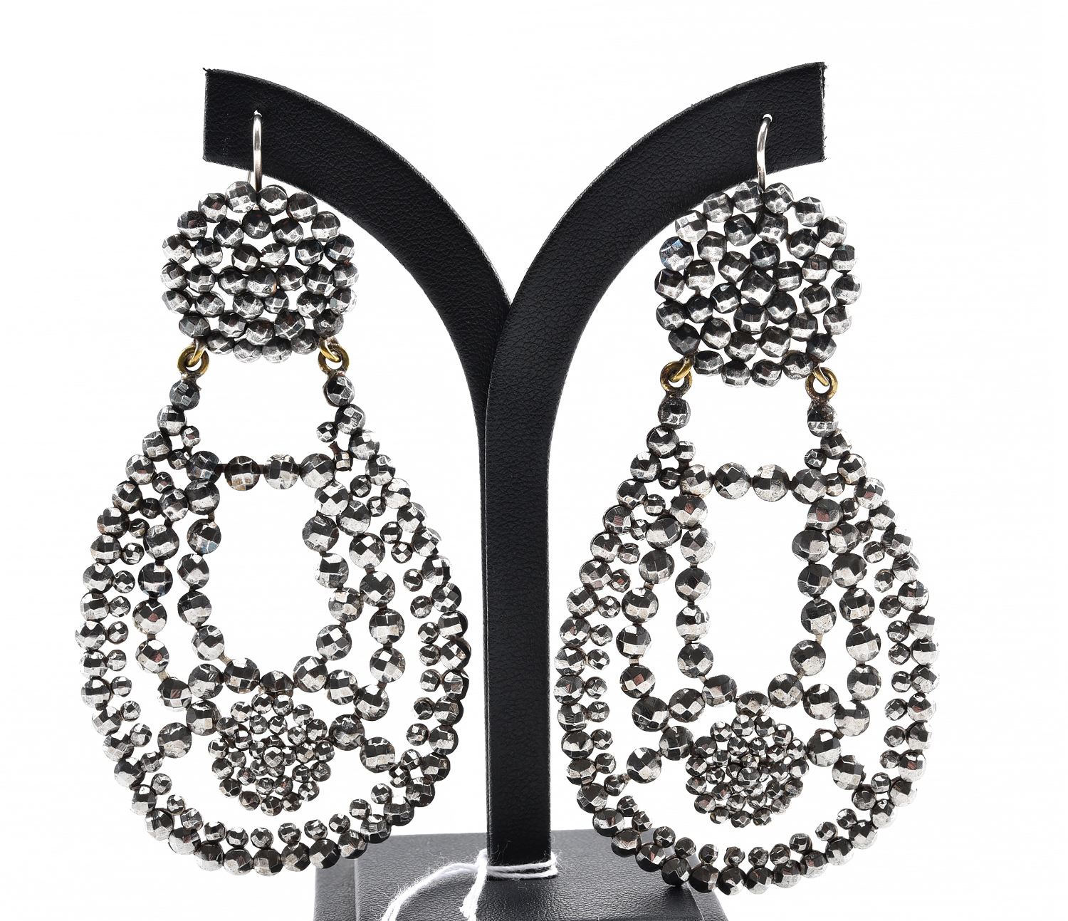 A PAIR OF GEORGIAN CUT STEEL GIRANDOLE EARRINGS, TO SILVER HOOK FITTINGS, LENGTH 85MM, RETAILED BY KOZMINSKY