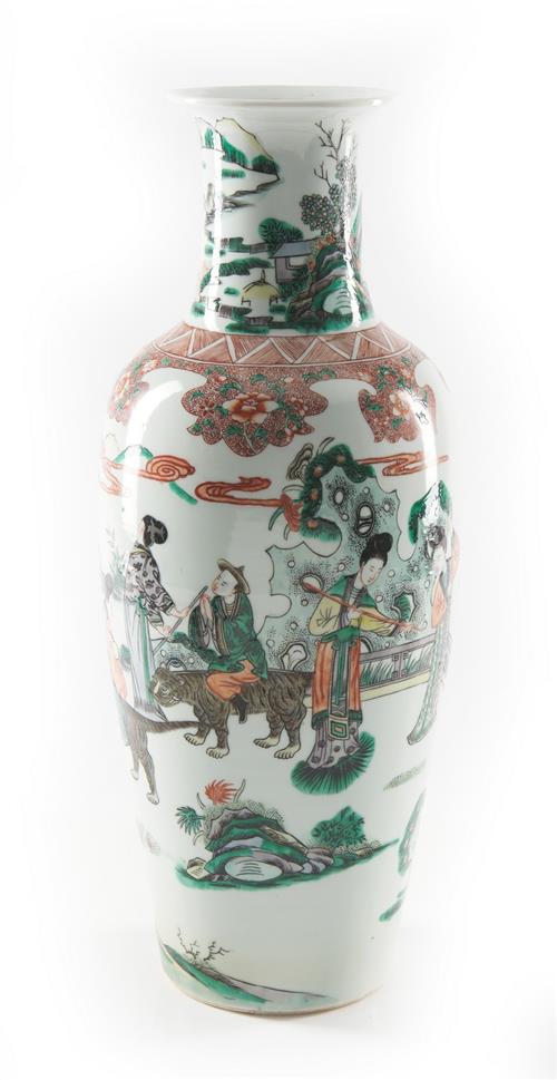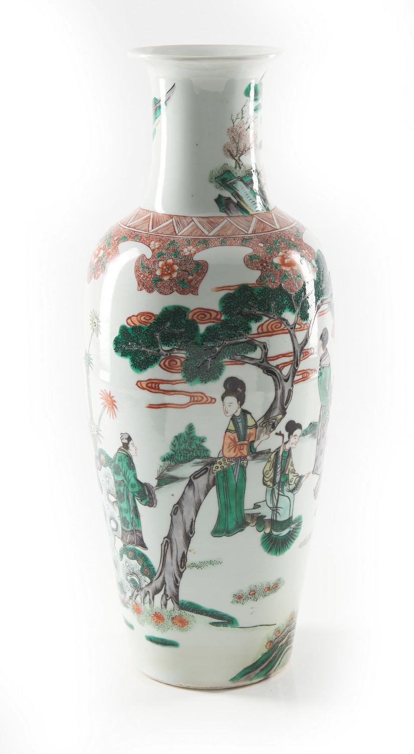 The tall vase decorated in wucai enamels with figures in a garden landscape.