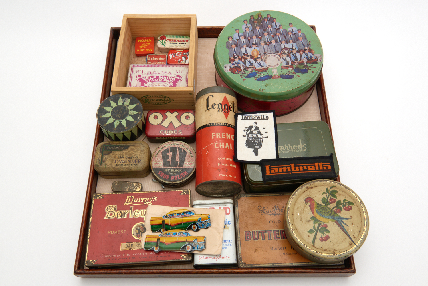 A COLLECTION OF VINTAGE ADVERTISING TINS AND ASSOCIATED PRODUCTS, INCLUDING OXO, SPLENDOR LIGHT BULB, 'EZY' EASY SHINE SHOE POLISH, LEGGETTS FRENCH CHALK AND OTHER ITEMS