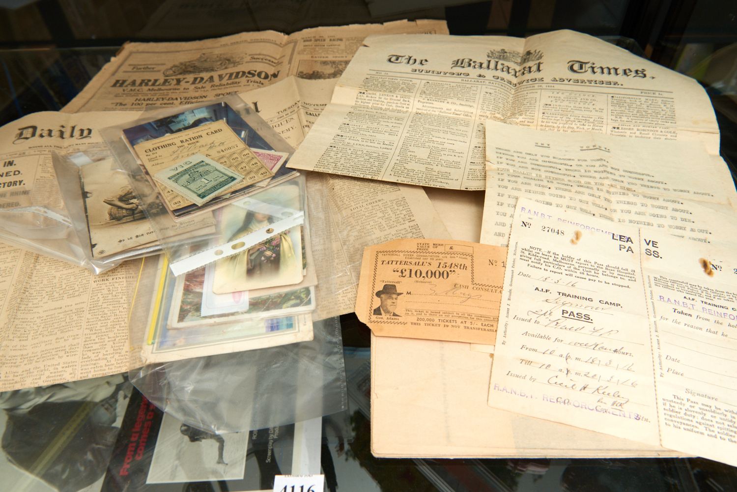 A COLLECTION OF AUSTRALIANA AND WORLD WAR I RELATED EPHEMERA, INCLUDING A PORTION OF THE DAILY MAIL FROM TUESDAY 12 NOVEMBER 1918, ANNOUNCING THE ARMISTICE; A SECTION OF THE BALLARAT TIMES FROM 1854; A 1916 A.I.F. TRAINING CAMP R.A.N.B.T. REINFORCEMENTS LEAVE PASS, DATED 18 MARCH 1916; A COLLECTION OF RATION CARDS/VOUCHERS; A COLLECTION OF ASSORTED POSTCARDS AND A PORTION OF THE HERALD FROM 30 MARCH 1921