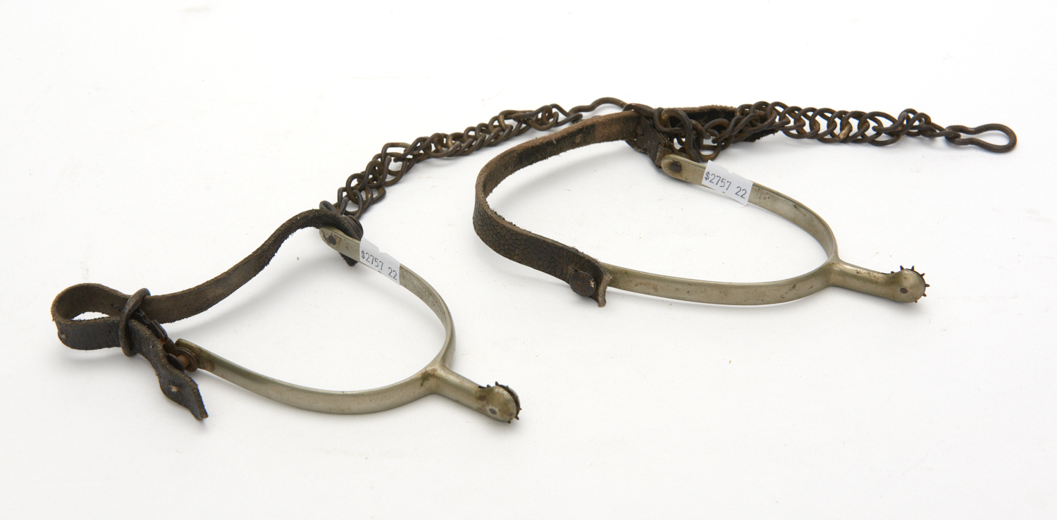 A PAIR OF MILITARY SPURS, WWI/WWII, WITH HEEL CHAINS AND LEATHER STRAPS, MARKED INDISTINCTLY