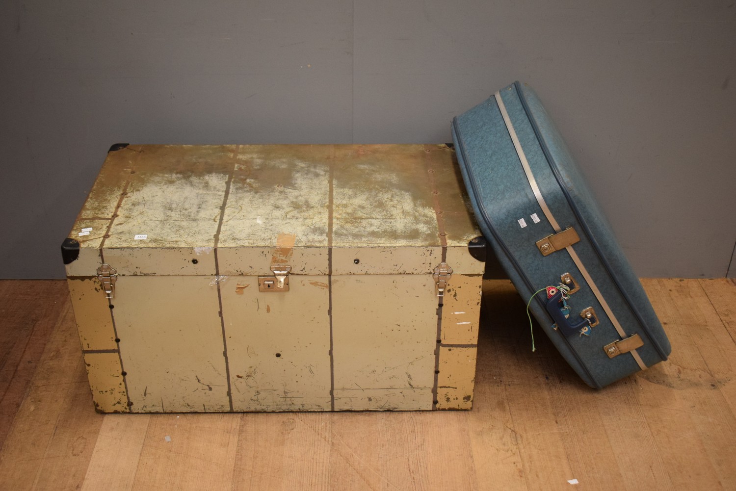A VINTAGE ZINC MOUNTED TRAVEL TRUNK AND A VINTAGE SUITCASE (50H x 90W x 50D CM)