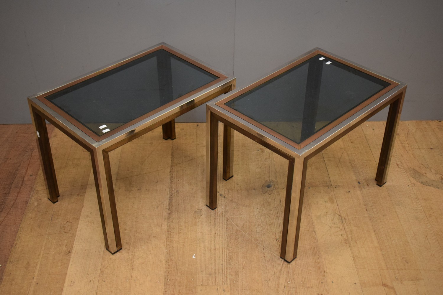 A PAIR OF CHROME, BRASS AND GLASS TOPPED SIDE TABLES (46H x 60W x 40D CM)
