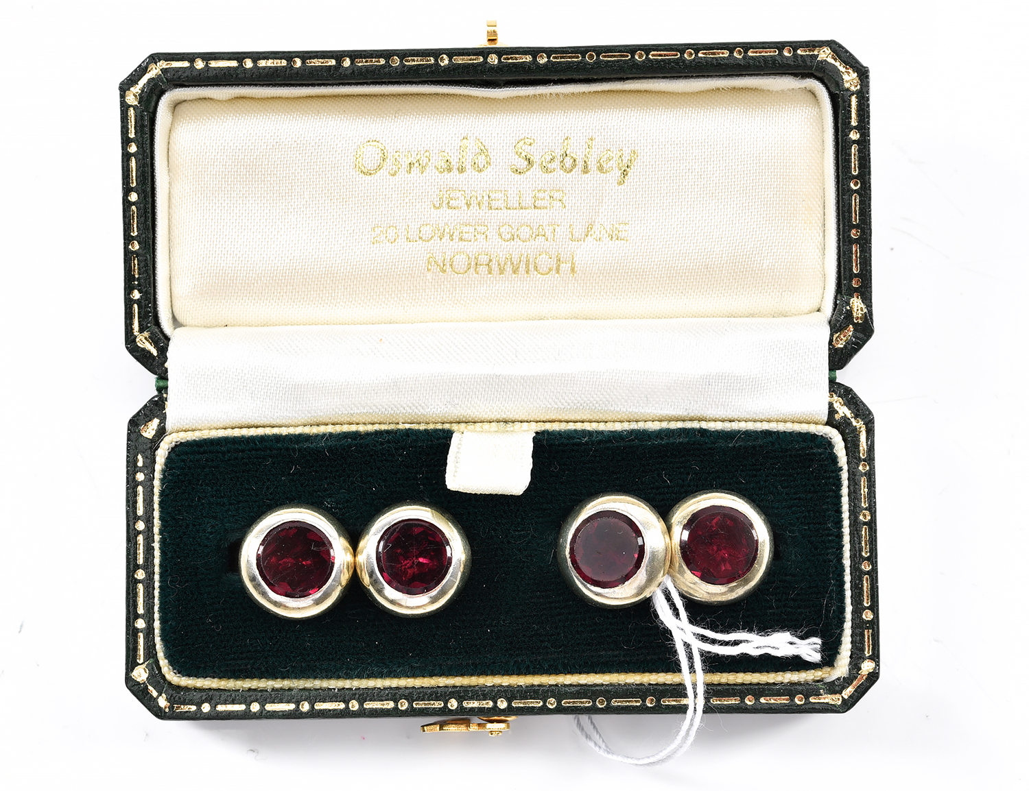 A PAIR OF GARNET CUFFLINKS WITH HALLMARKS, IN SILVER GILT, BOXED