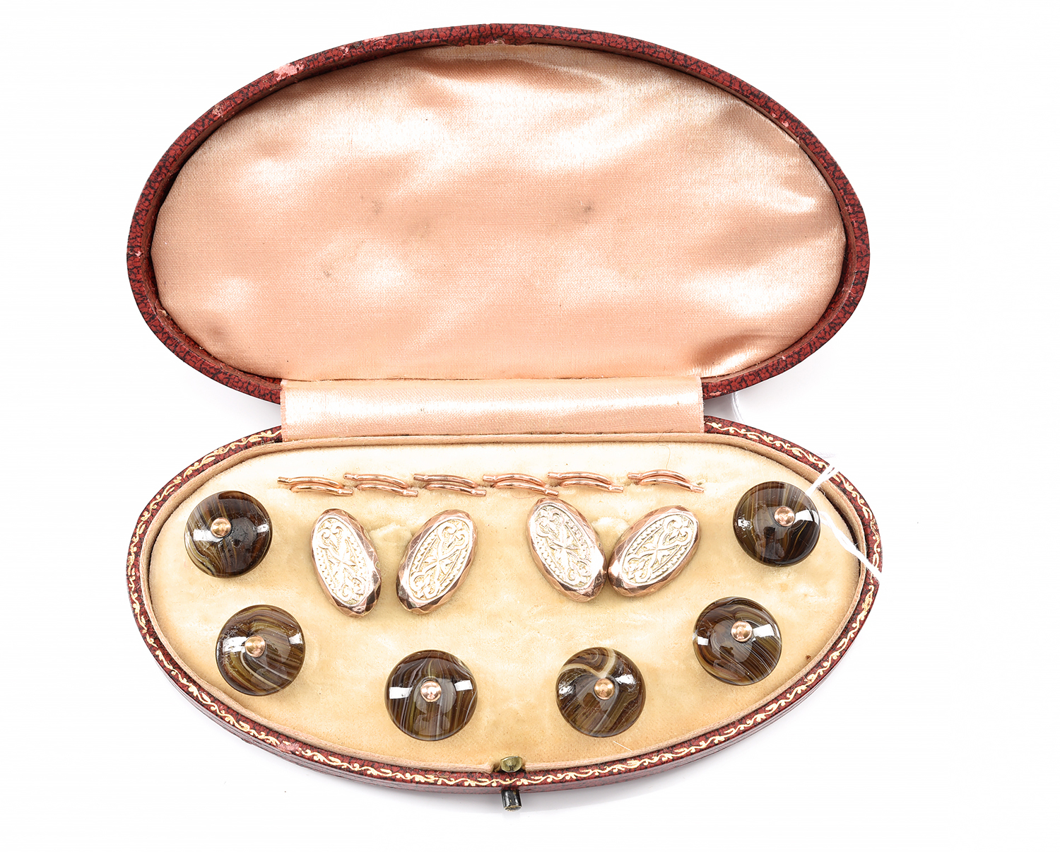 A BOXED SET OF SIX AGATE SHIRT STUDS, TOGETHER WITH A PAIR OF ENGRAVED GOLD LINED CUFFLINKS