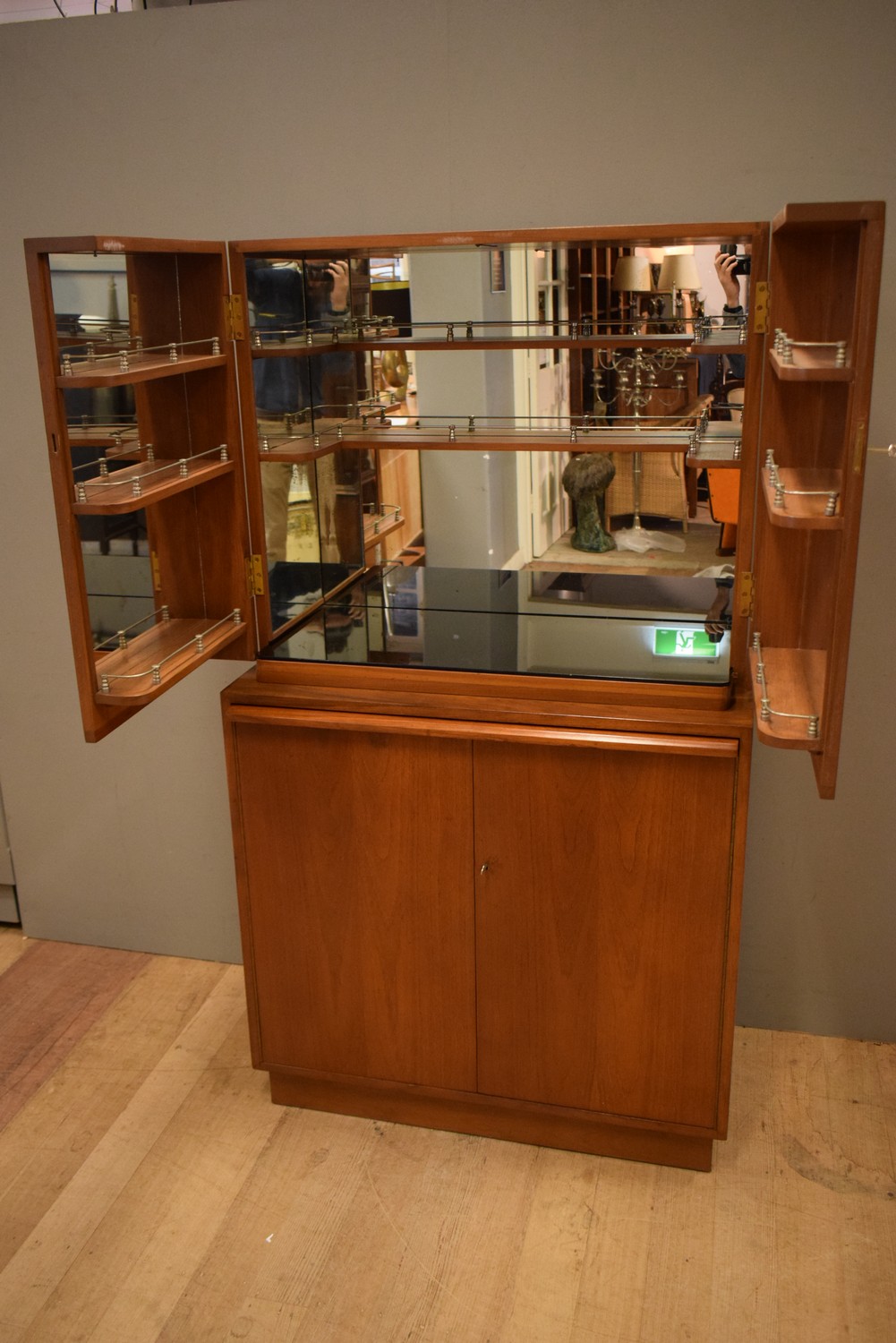 A MID-CENTURY DOUBLE BODIED DRINKS CABINET WITH TRAY (166H X 93W X 46D) (PLEASE NOTE THIS ITEM MUST BE REMOVED BY CLIENTS OR CARRIERS AT THE CUSTOMERS EXPENSE) (KEY WITH STAFF)