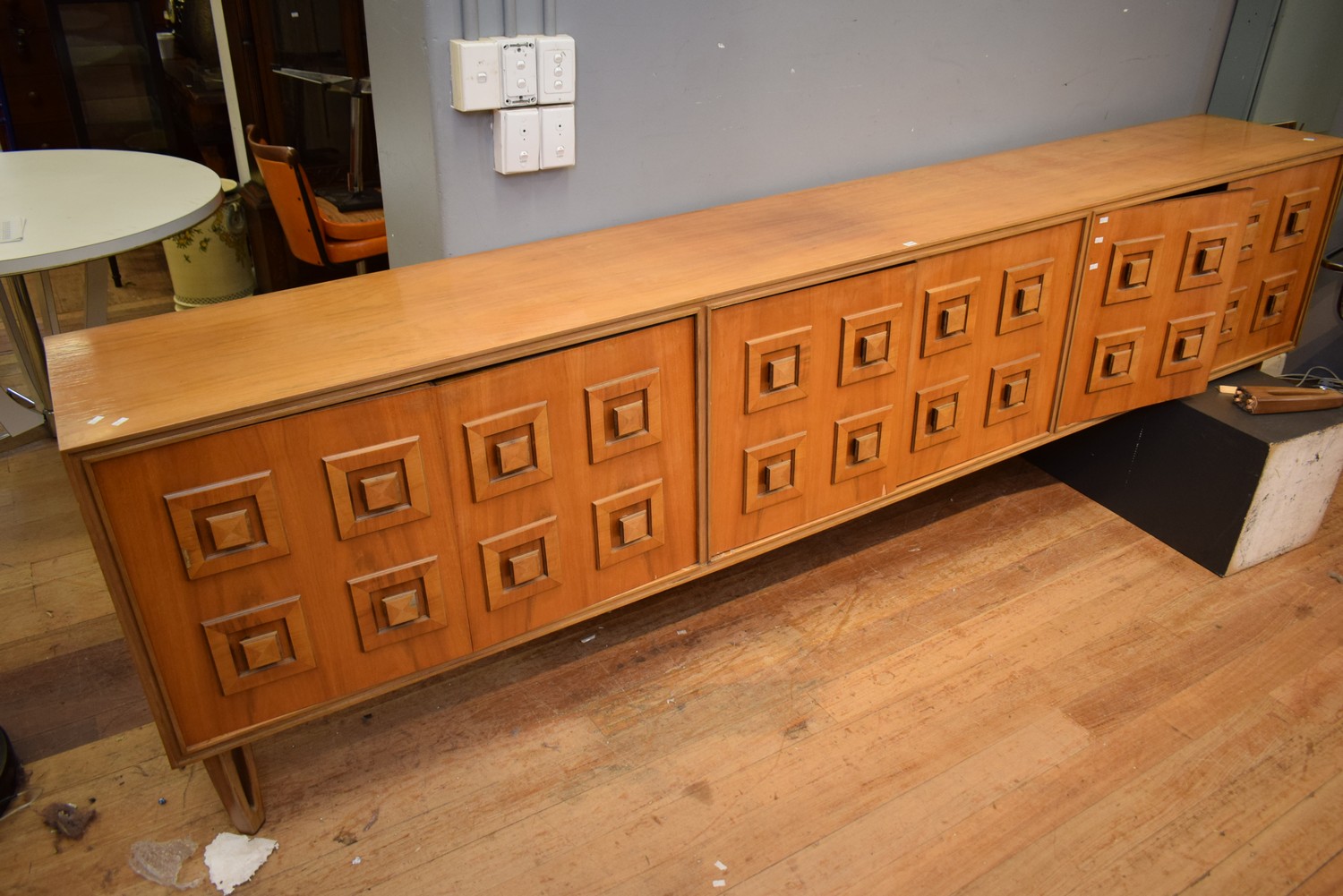 A 1960S JACOB RUDOWSKI LARGE SIDEBOARD (A/F DAMAGE TO BACK LEG) (87H X 305W X 46D) (PLEASE NOTE THIS ITEM MUST BE REMOVED BY CLIENTS OR CARRIERS AT THE CUSTOMERS EXPENSE)